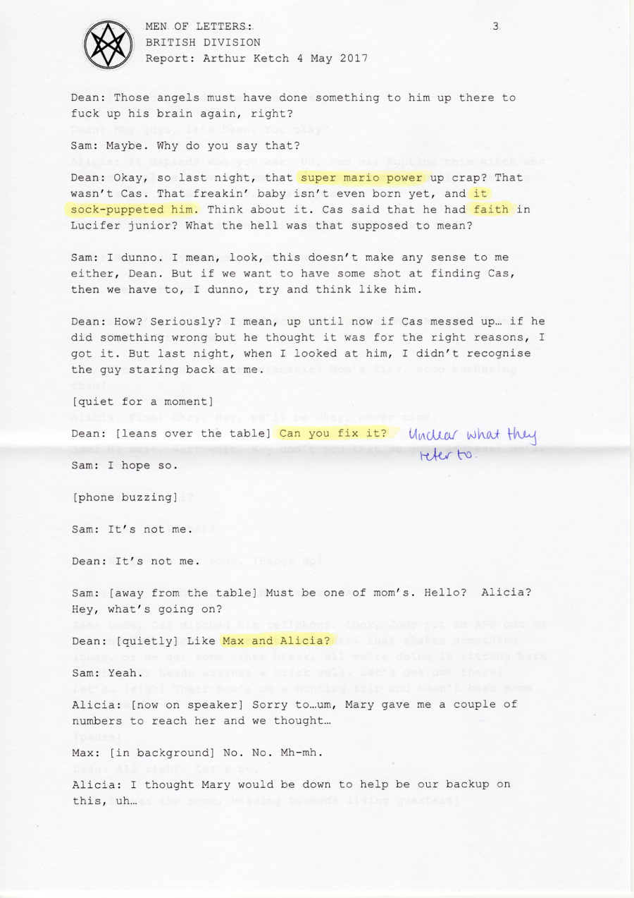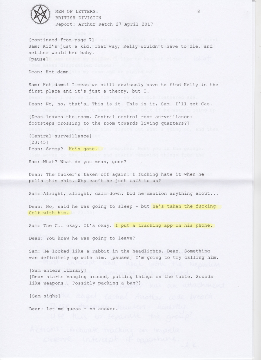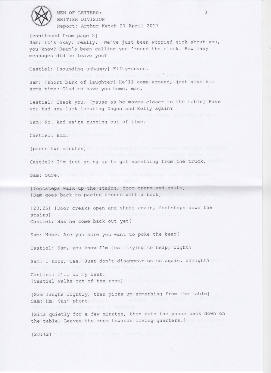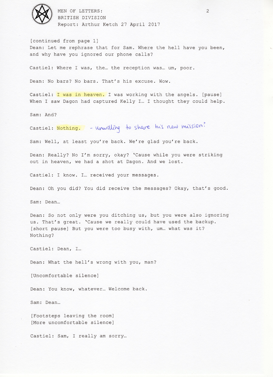 Castiel: Thank you. [pause as he moves closer to the table] Have you had any luck locating Dagon and Kelly again?