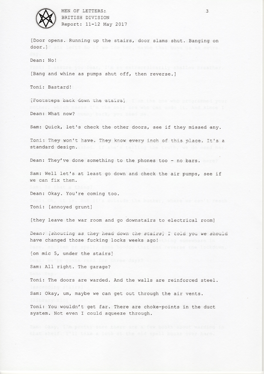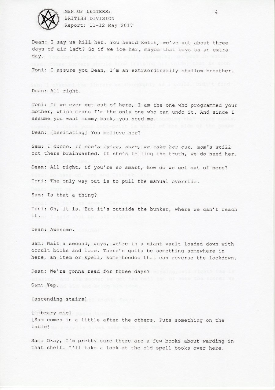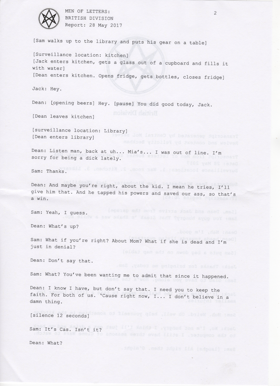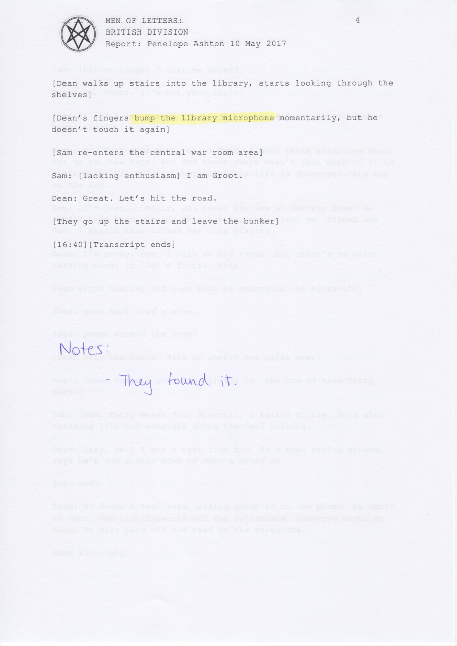 In early 2017, the British Men of Letters installed a number of microphones around the Winchesters' bunker. One was discovered, some were destroyed, but there are still one or two around, and the BMOL back in London are still recording and listening.