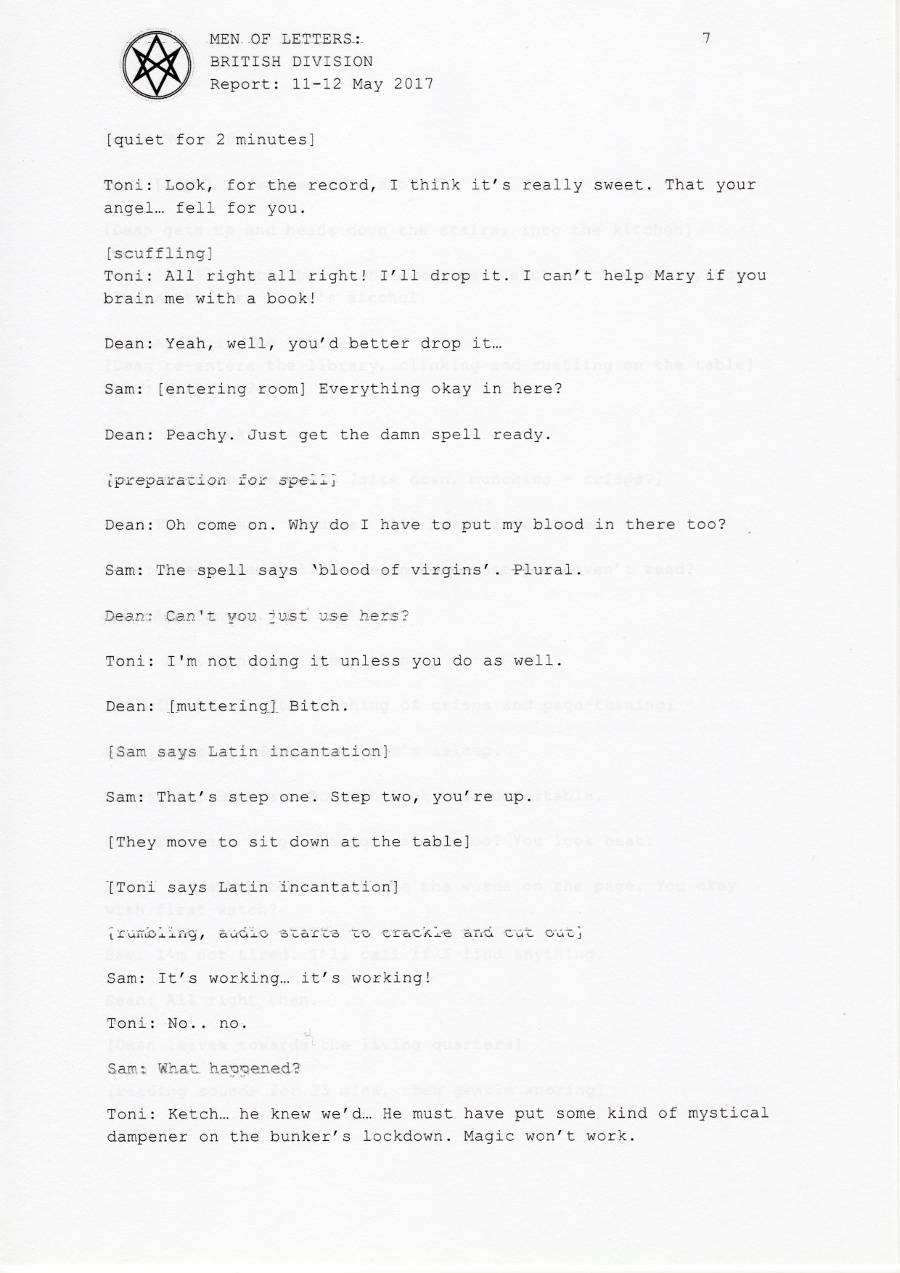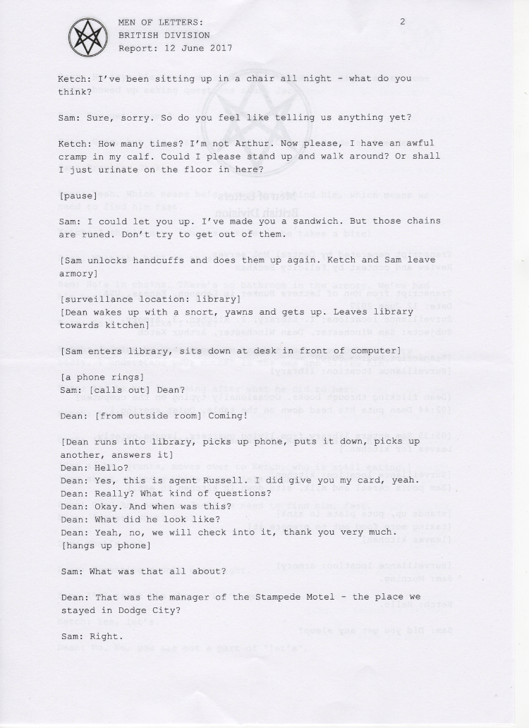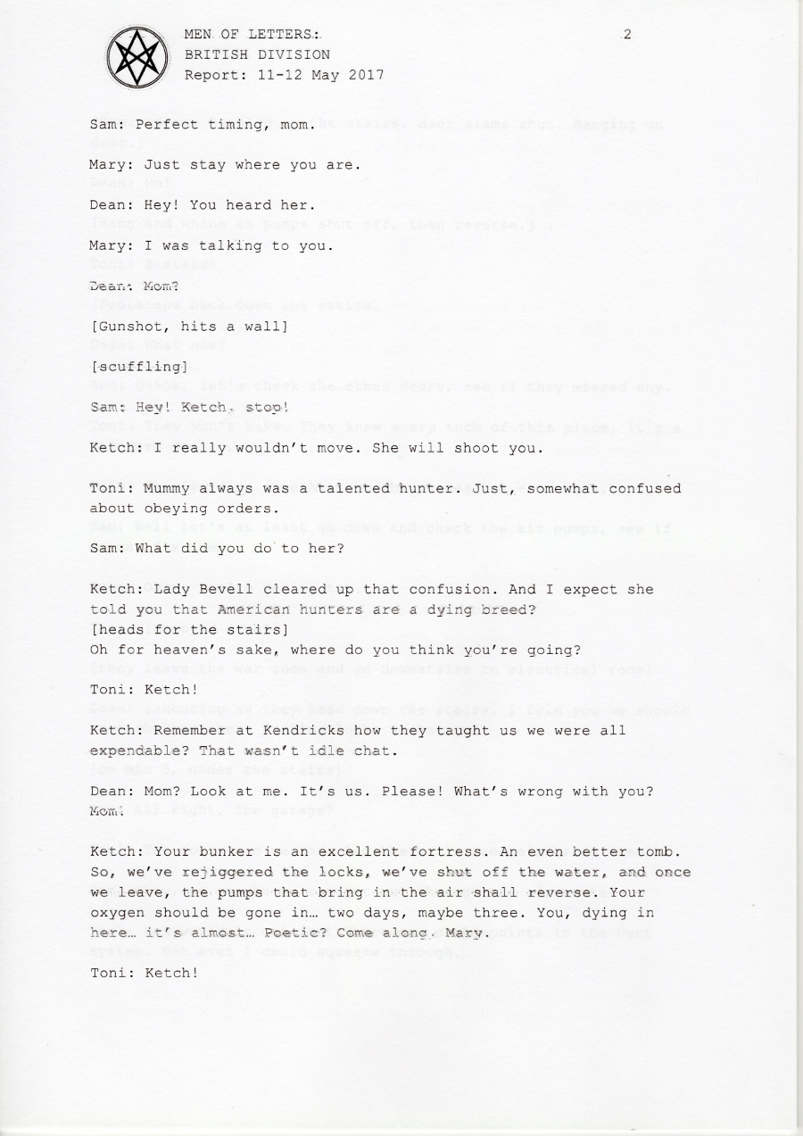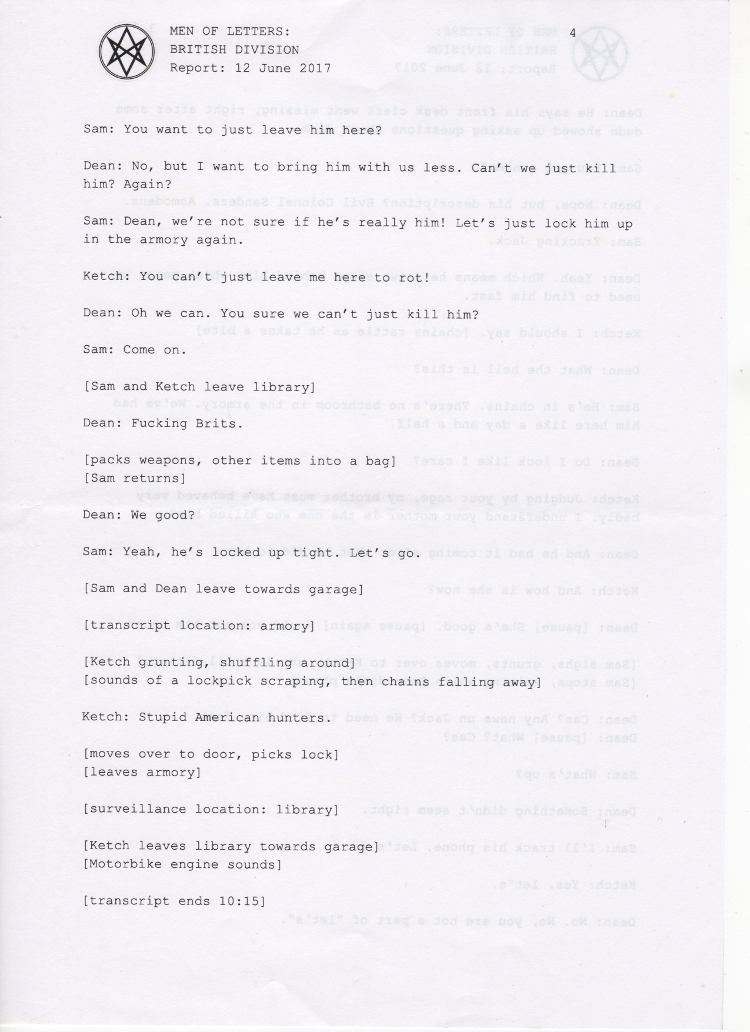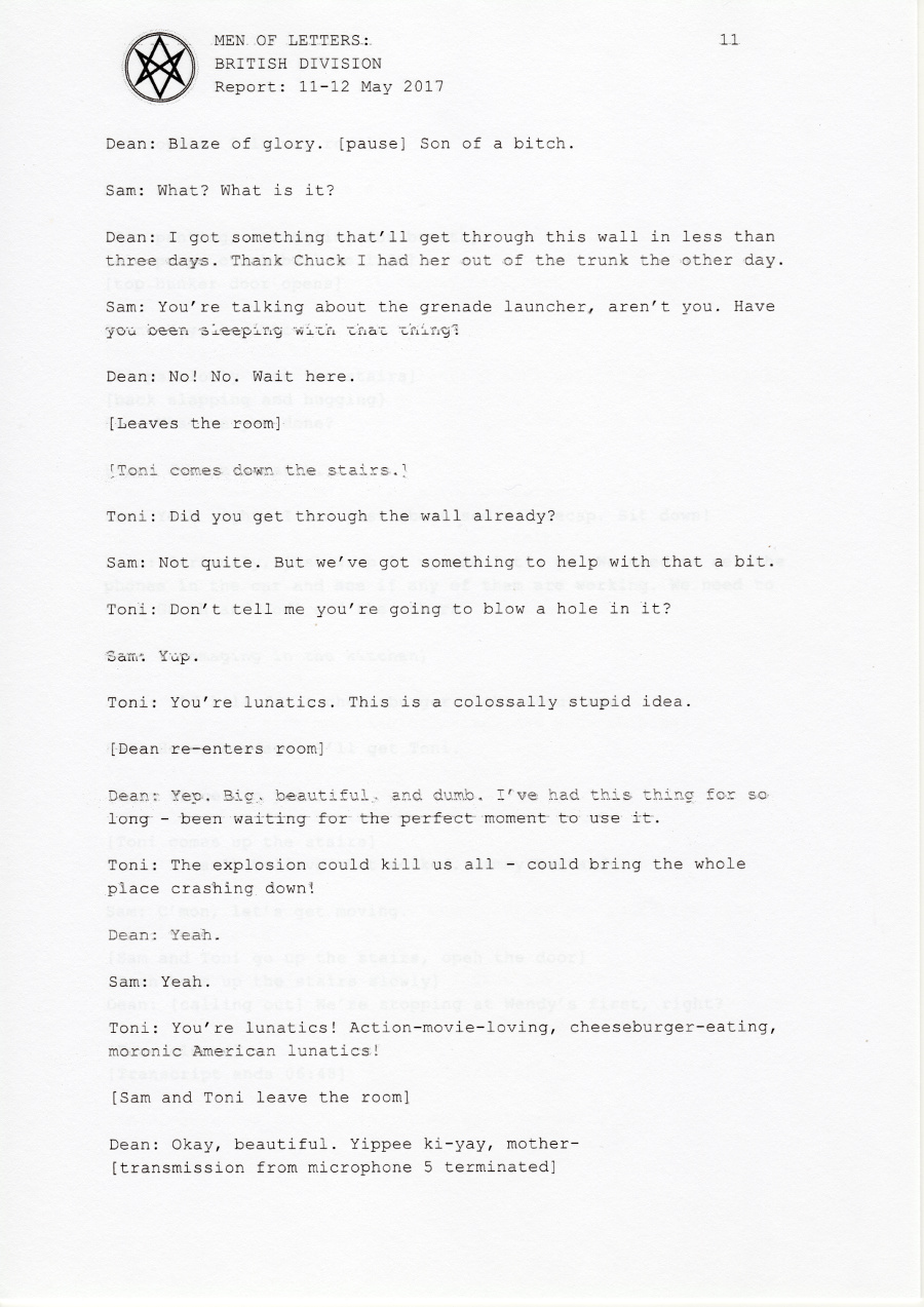 In early 2017, the British Men of Letters installed a number of microphones around the Winchesters' bunker. One was discovered, some were destroyed, but there are still one or two around, and the BMOL back in London are still recording and listening.