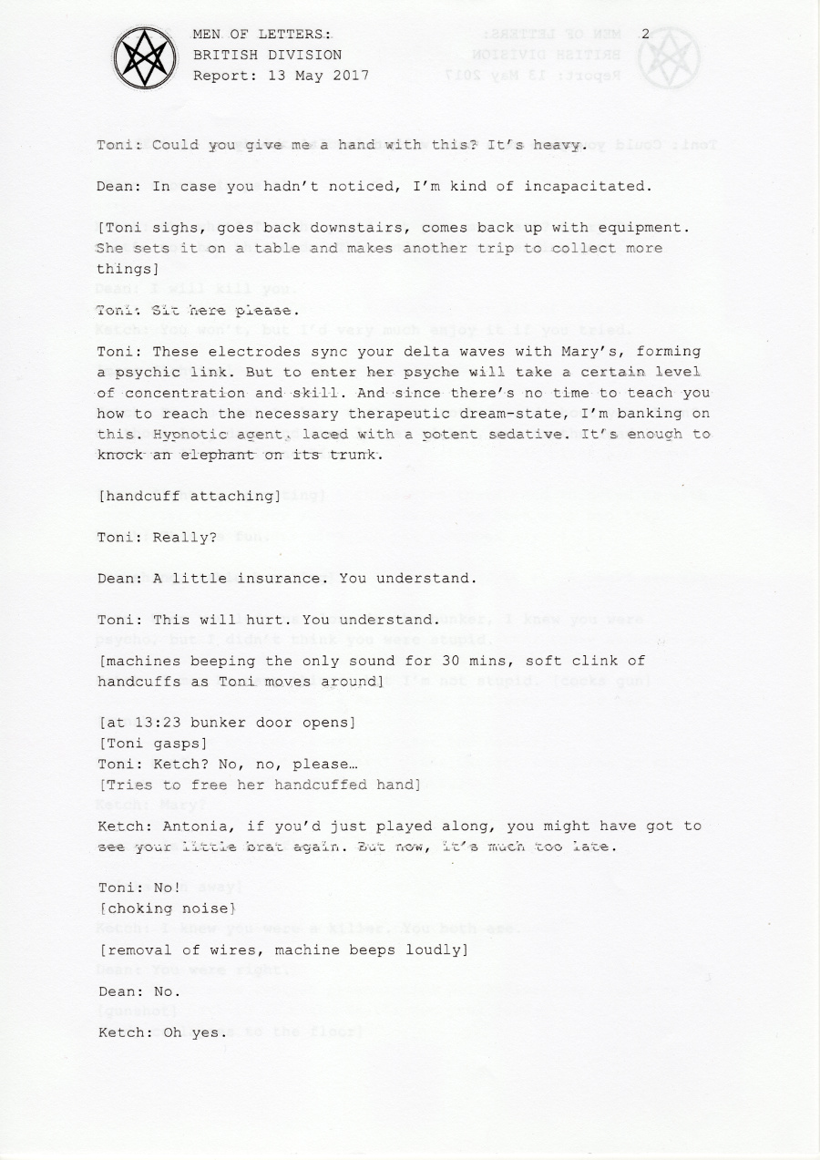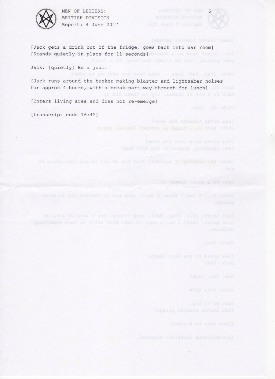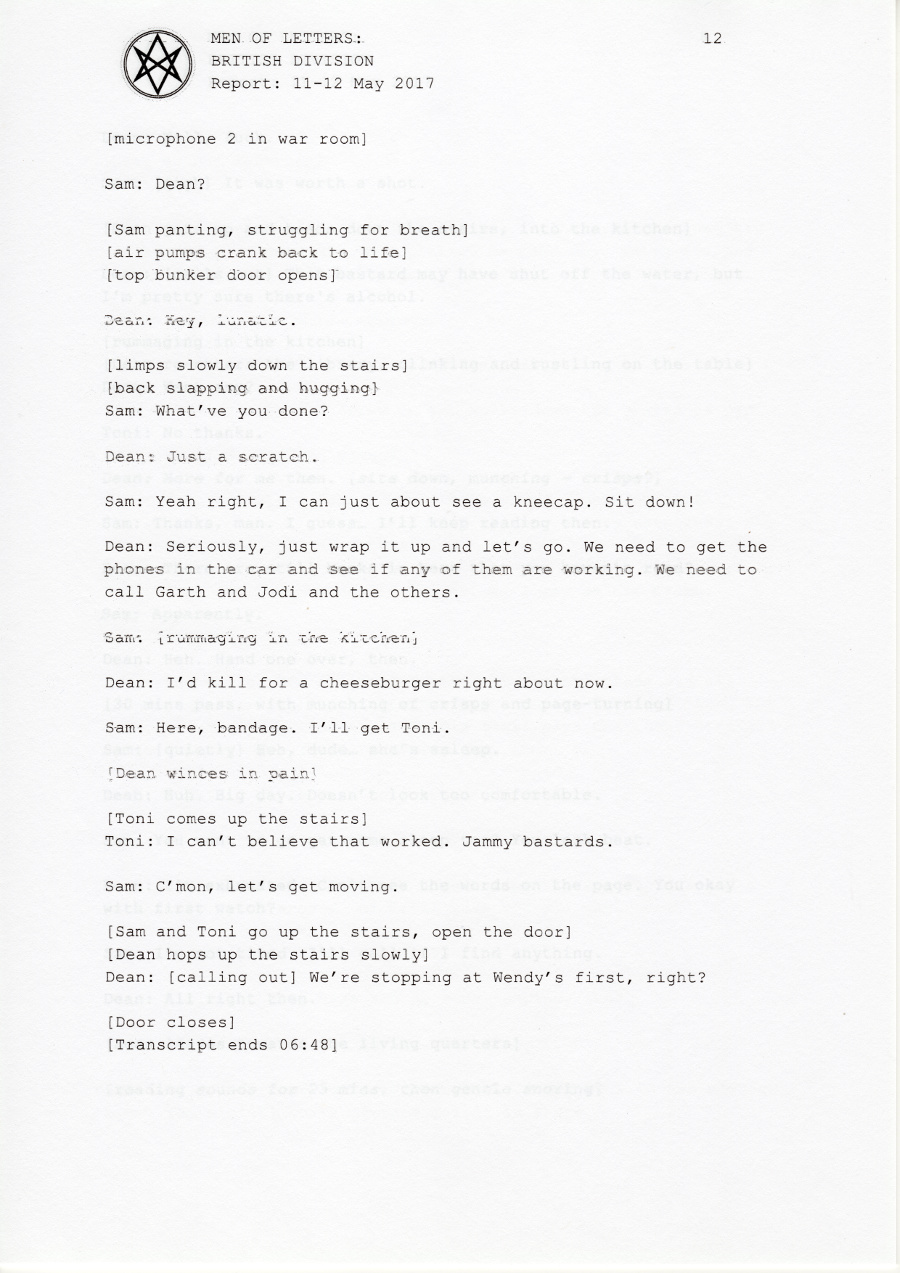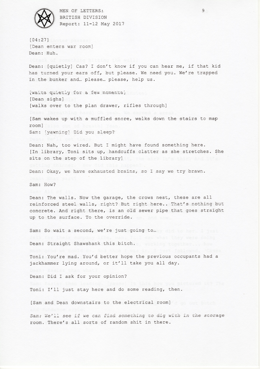 In early 2017, the British Men of Letters installed a number of microphones around the Winchesters' bunker. One was discovered, some were destroyed, but there are still one or two around, and the BMOL back in London are still recording and listening.