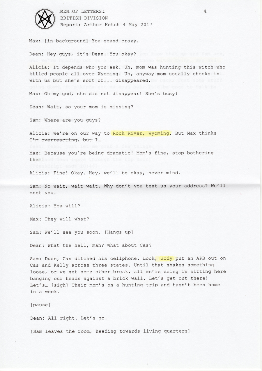 Mary: They’re still in Kansas, not too far away from here, I think. Castiel, you want to come?