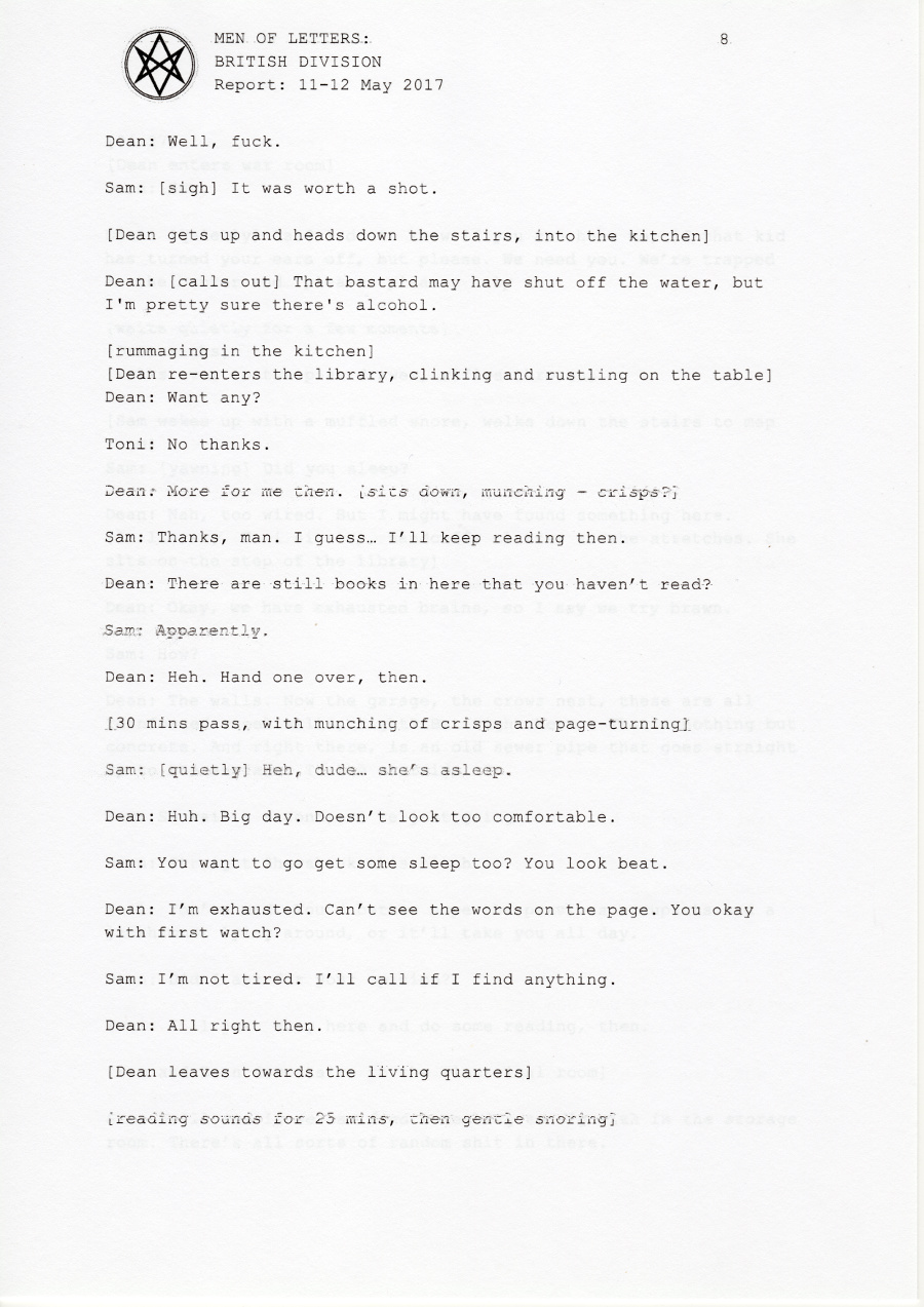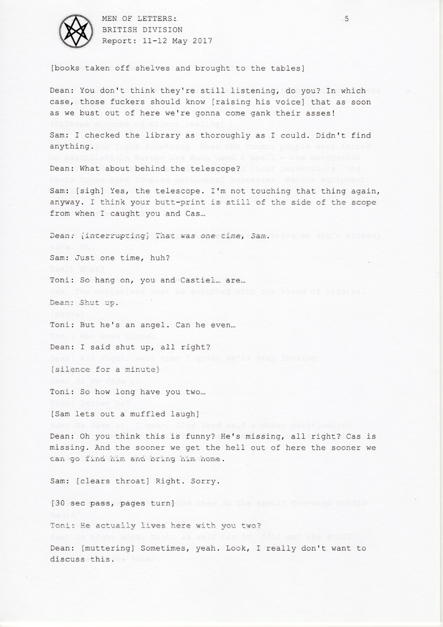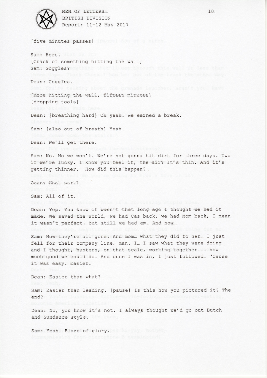 Dean: Who the hell knows? Probably in his room, chatting with Eileen.