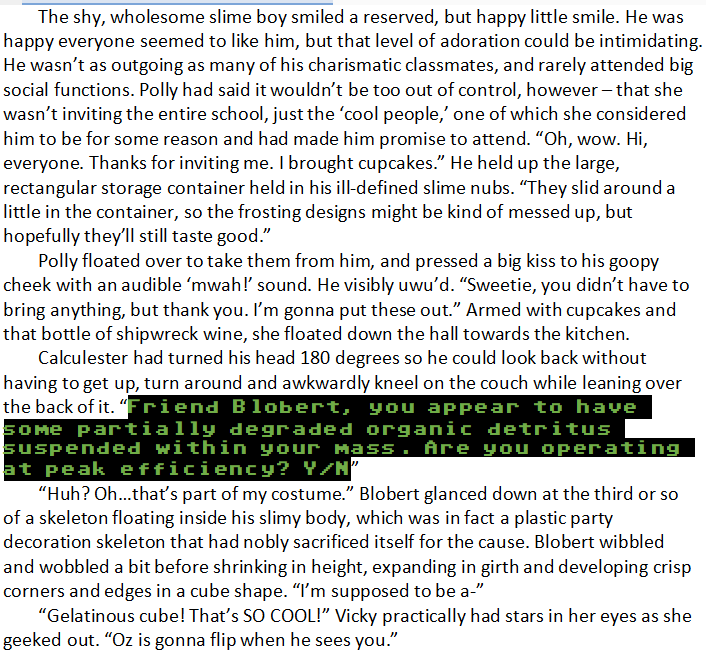 “Huh? Oh…that’s part of my costume.” Blobert glanced down at the third or so of a skeleton floating inside his slimy body, which was in fact a plastic party decoration skeleton that had nobly sacrificed itself for the cause. Blobert wibbled and wobbled a bit before shrinking in height, expanding in girth and developing crisp corners and edges in a cube shape. “I’m supposed to be a-”