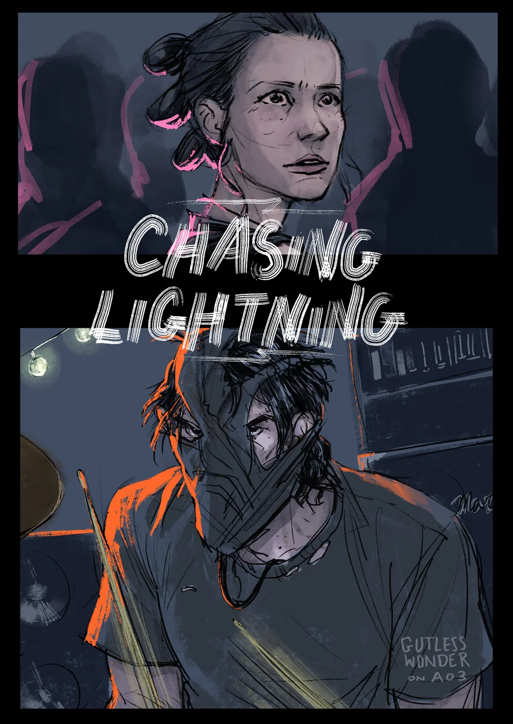The redheaded man she’d seen earlier, Hux, was off to the side of the stage twanging a bass with his exposed pale arms dramatically, and to the other side was an extremely tall and strong-looking woman with short cropped blond hair and an icy gaze. And between them, over a drum kit set up more towards the front of the stage than is usual, a large, hulking man was beating away at the set, his legs tapping in quick rhythms, striking a booming bass drum beat eerily reminiscent of a desperate heartbeat.
