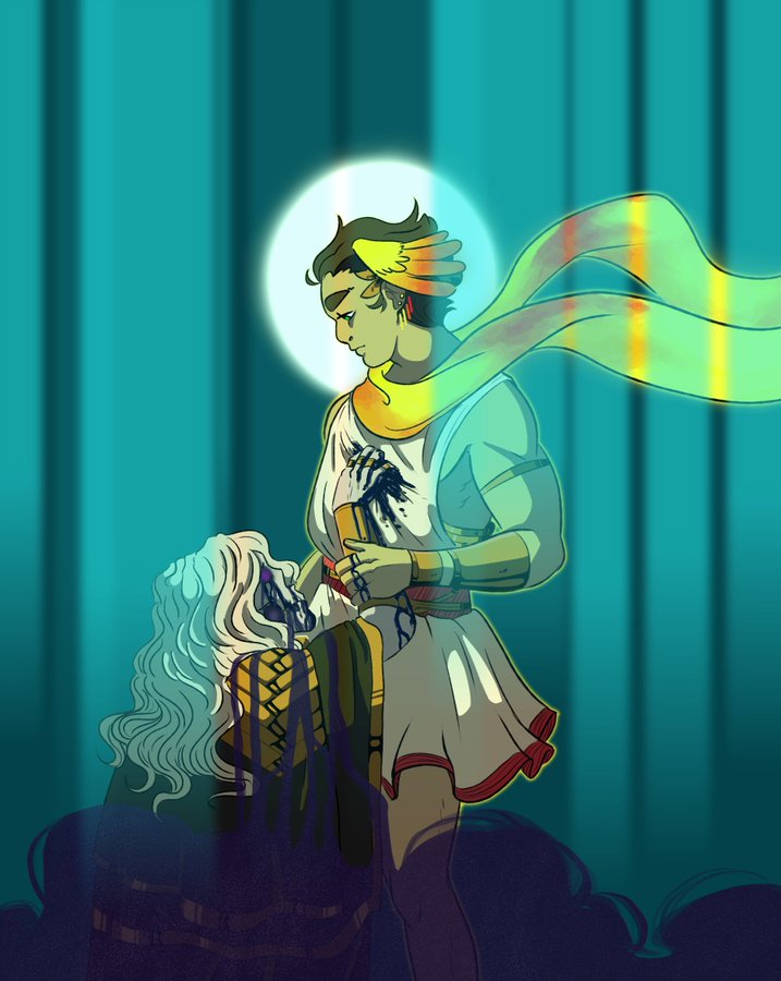 “Hey,” Hermes whispers to Charon closely, craning his neck up and being hidden by Charon’s pale locks. “What if we escape, just for a moment? Leave our own party for just a minute, just before we go?”
