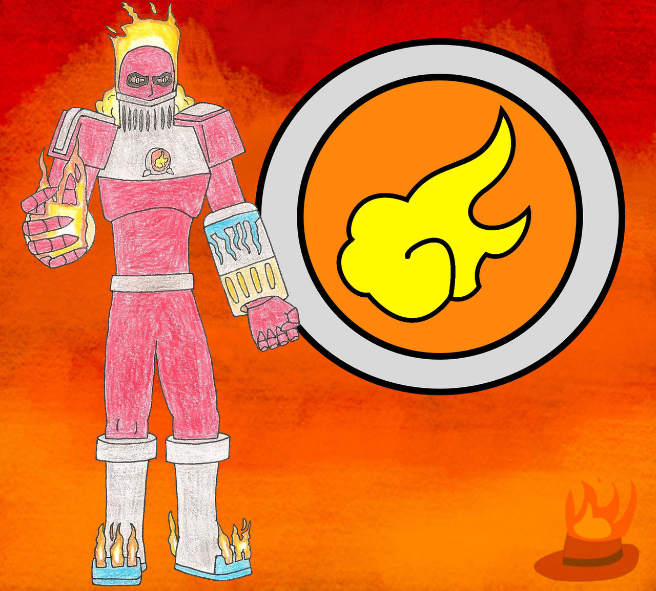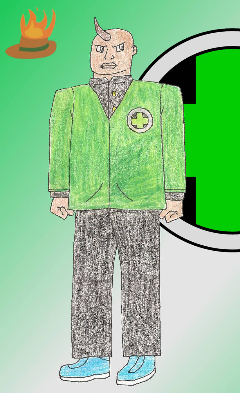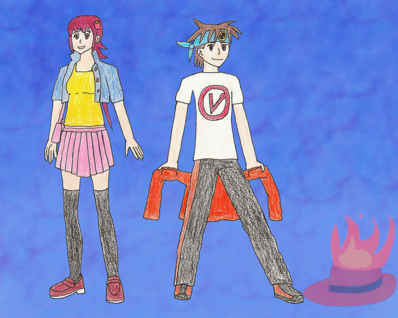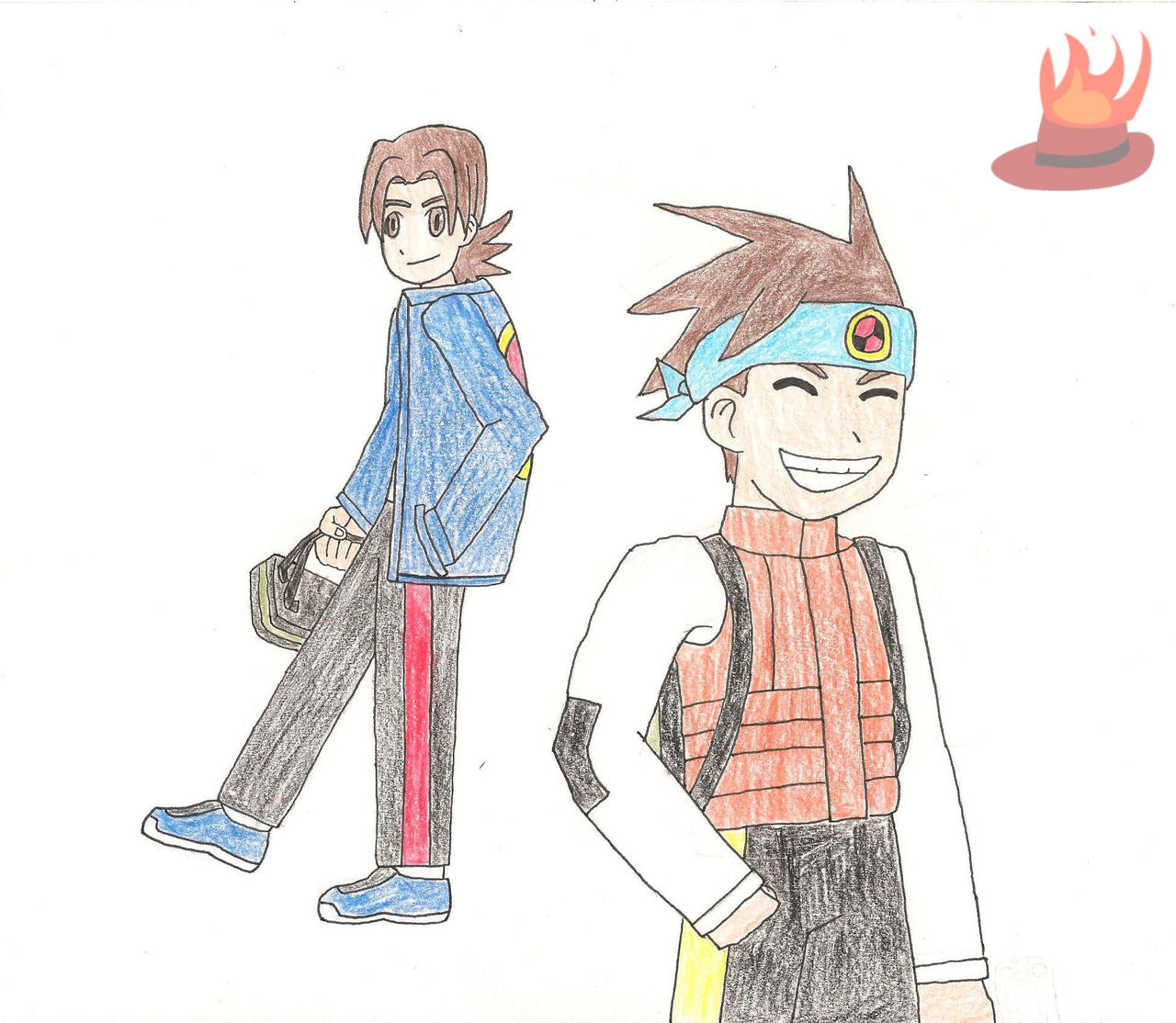 I wore a bright orange jacket over a black school shirt, with black pants and orange shoes with black soles. Aside from a black backpack with black straps, I also had a blue bandana tied around my arm, showing an emblem. The emblem was a red circle with a black line moving diagonally through the center, ending at two black triangles, one in the lower left side and one in the top right side, with a yellow ring surrounding the entire circle. I had messy and spiky brown hair, brown eyes, and tan skin.