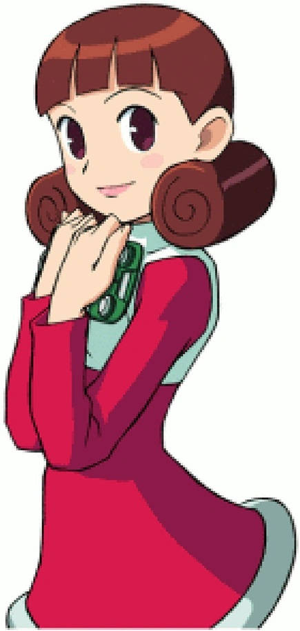 She had a fair skin tone, brown eyes, and long maroon hair that reached down to her waist. Bangs covered her forehead as some long strands covered part of her ears. There was a hair piece on the left side of her head that seemed to stick out. It was a red-rose color, though there was some yellow that took up a bit of the circle so it would resemble a cherry blossom.