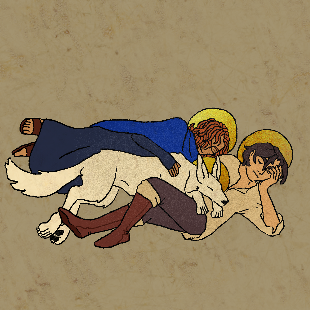 It’s different enough from their usual routine to make Trevor feel clumsy. He misses the rituals—the piling of furs and blankets, the sleepy banter. Even with one less person, the bed is too small to share comfortably. Trevor is about to drop a pillow on the floor beside it when a cold nose nudges his arm. Wolf Adrian looks at him impatiently.