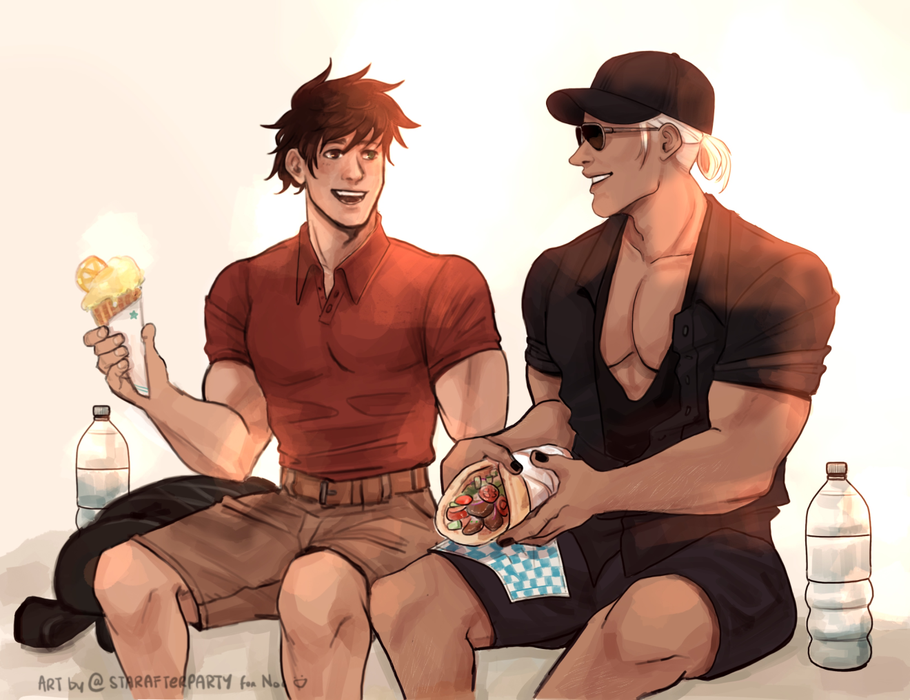 “You want to shower in the dressing room or head back to the hotel?” Hypnos cracks open another bottle of water, using it to dampen a fresh white towel. He passes it over, watching as Than wipes the sweat from the back of his neck, sighing with relief.