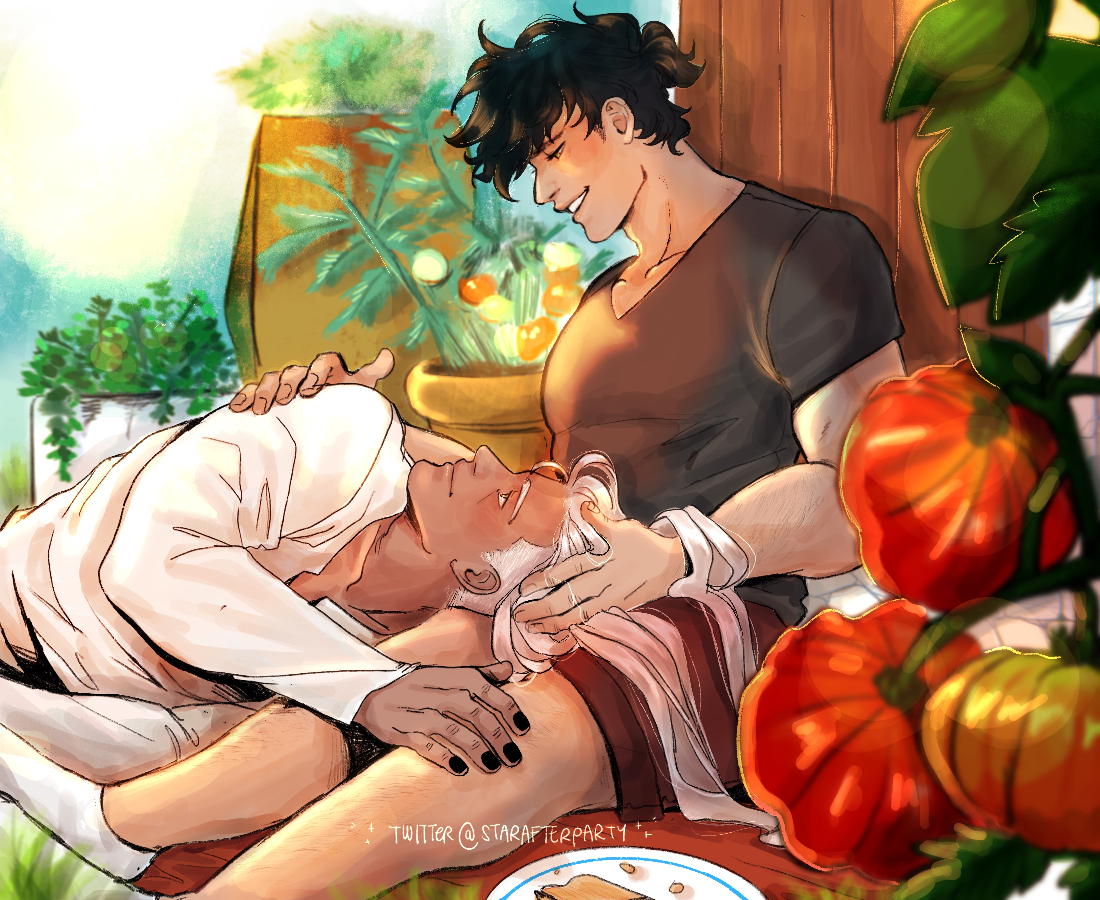 Zag steps out into the sunlight, smiling as it kisses his tanned skin. He adores being outside, in the sun and the fresh air, the endless, perfect blue sky stretching out far above his head. He makes his way slowly down the path, breathing in the scents of the abundant plants and flowers growing in his mother’s garden, meandering between the neatly tended beds to the tomato plants. He stops, closing his eyes and breathing in the warm, rich aroma before stepping forward to pluck three plump tomatoes from the vine. He raises one to his nose, amazed at how good the ripe, sun warmed fruit smells compared to the tomatoes they stock on the yacht. They might be high quality, dutifully picked up fresh at every port, but they are nothing compared to freshly picked tomatoes from his mother’s garden.
