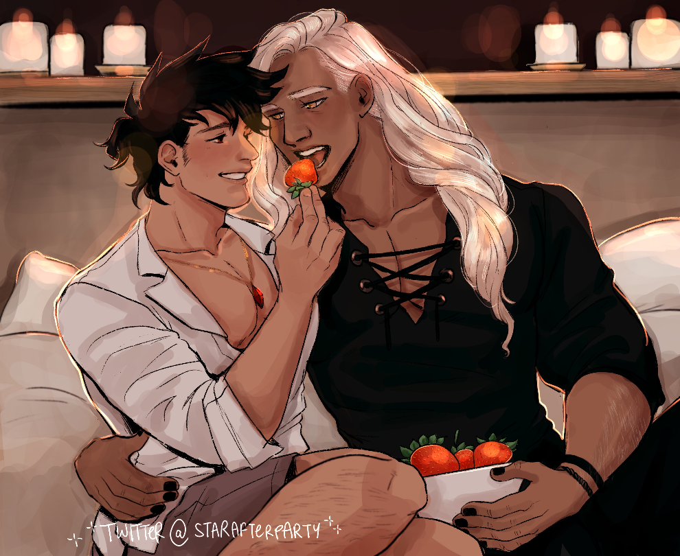 They drift apart eventually, exchanging matching goofily tender smiles and reaching for their wine in perfect synchronisation. It tastes perfect on Zag’s tongue, rich but still light, bursting with berries and honey. An idea strikes him, a fizz of excitement tingling in his mind.