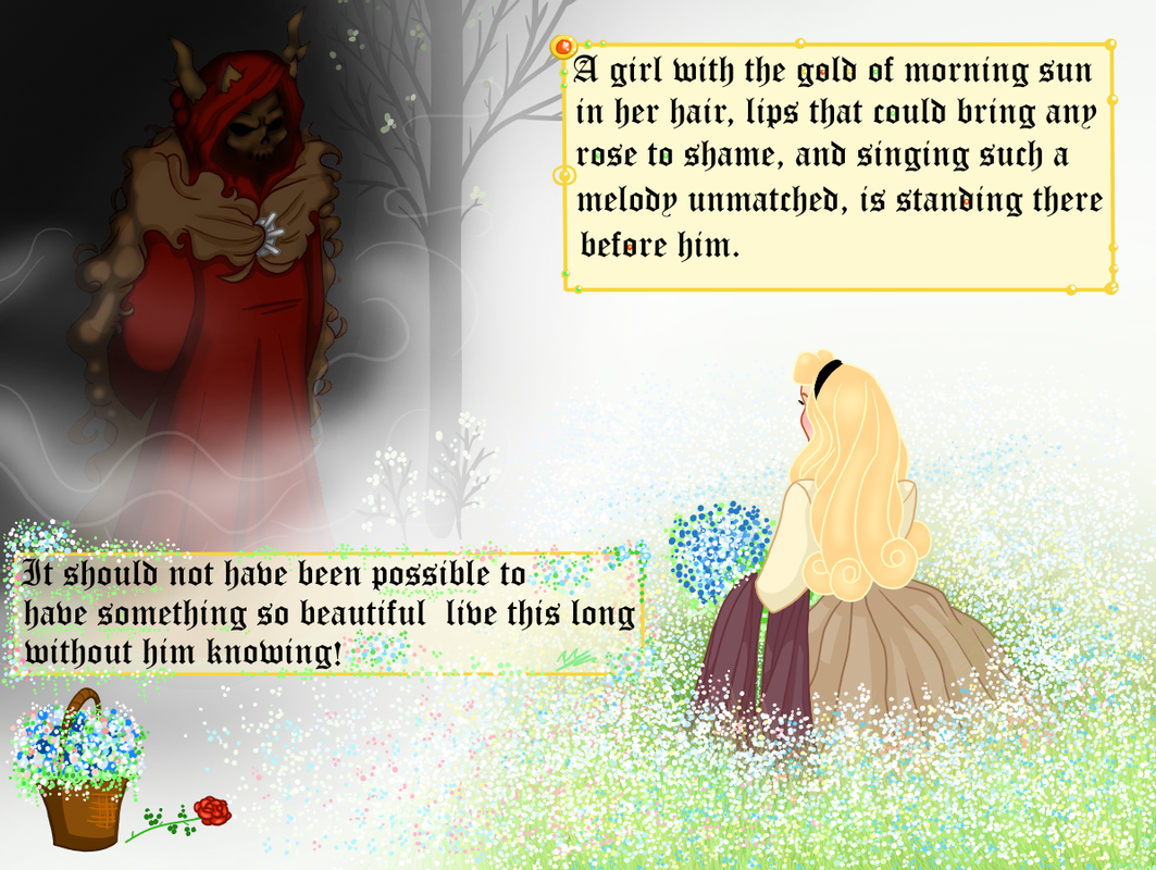His long fingers held up a rose, red like blood. She didn’t have much time to wonder where it had come from when it was offered for her to take. Rose took it slowly, mindful of the sharp thorns and brought it close to her face. It smelled sweet, like any rose would. The girl didn’t know it yet but as long as she was unharmed, it would stay alive, only growing more beautiful with time. The blonde smiled, shy but thankful. No one had ever given her such a gift. Her aunt Fauna would pick her forget-me-nots every year on her birthday, but that was it.