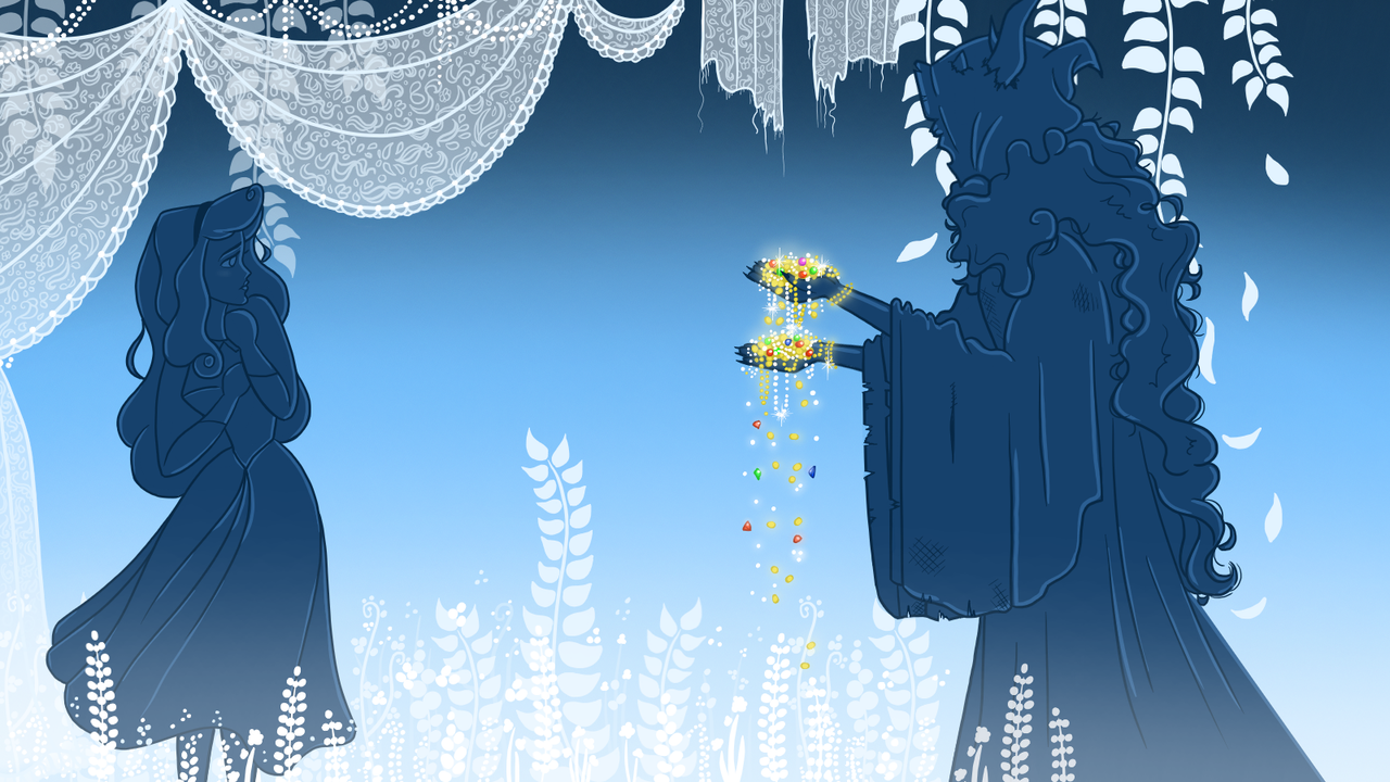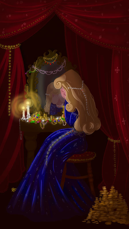 “ Perhaps you might find enjoyment in something more luxurious.” He extended his hands and opened up his palms. There piles and piles of gold and silver appeared, like born from his own body. There were stones of iridescent blue and red, pearls in long chains and golden ropes. As he beckoned for her to come have a closer look, some of the riches fell to the floor like grains of rice from between his fingers, but the piles didn’t dwindle. No, they seemed to only greaten.