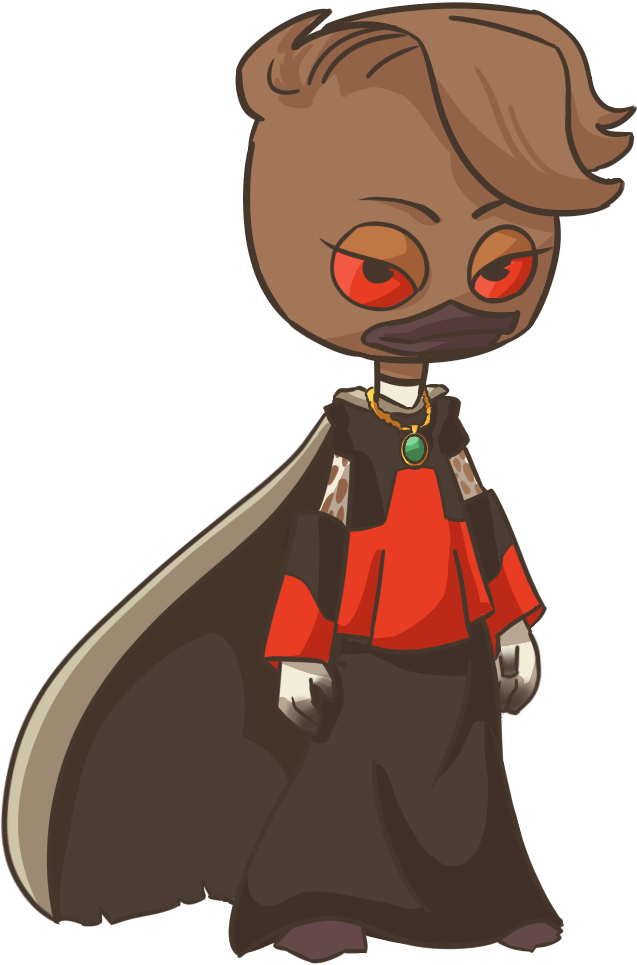 The top half was dress-like; sleeves cut off at the shoulders’ bottom. The top half was dark, and the bottom half was like her eyes. Halfway, an orange trapezoid shot up, ending as it met her displayed pendant. Below her exposed upper arms, segregated cloth adorned her forearms with a similar clothing scheme. A dark skirt wrapped her legs, hiding her feet. Finally, she bore a cape–dark on the inside and as white as her feathers on the outside. It smelled fresh.