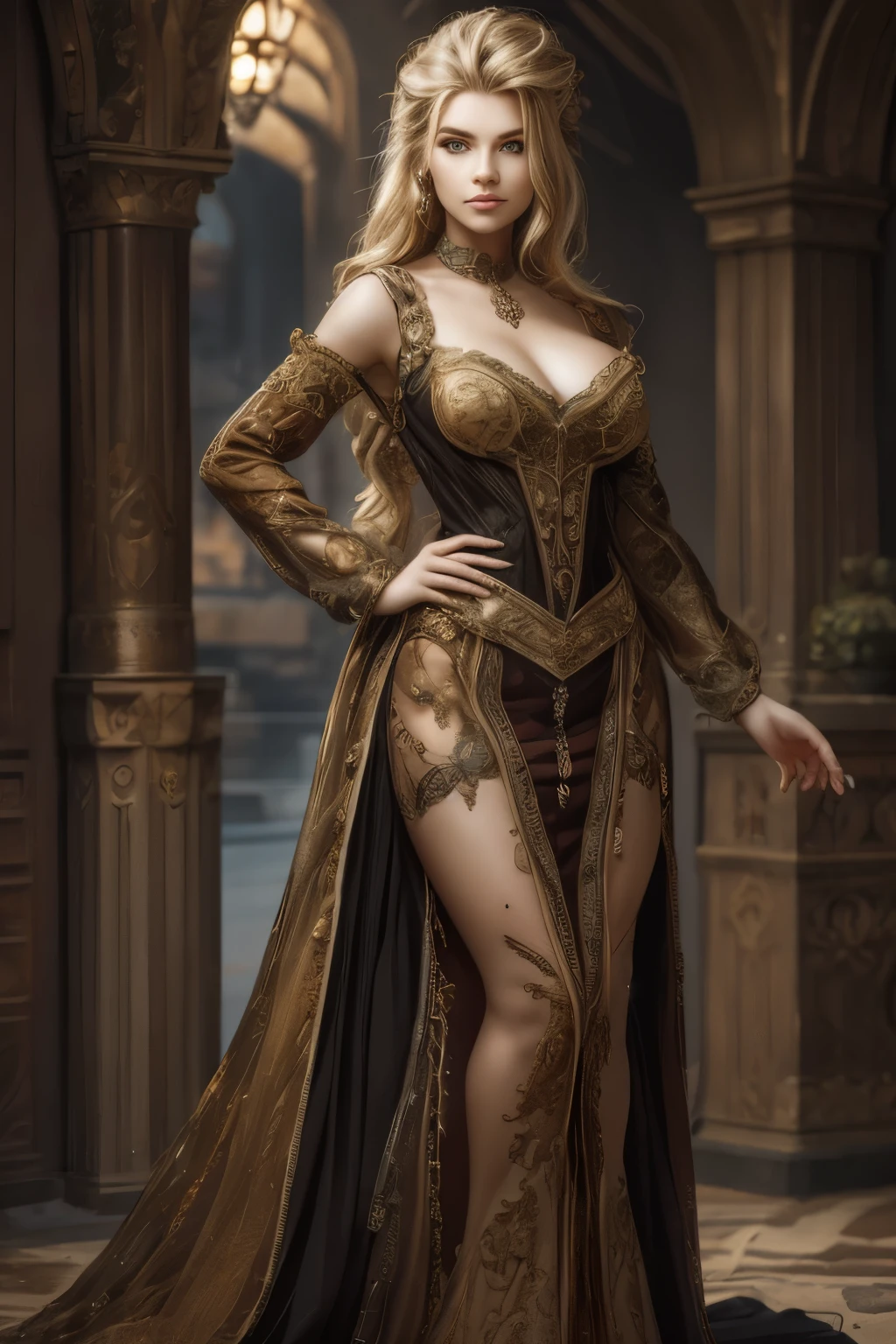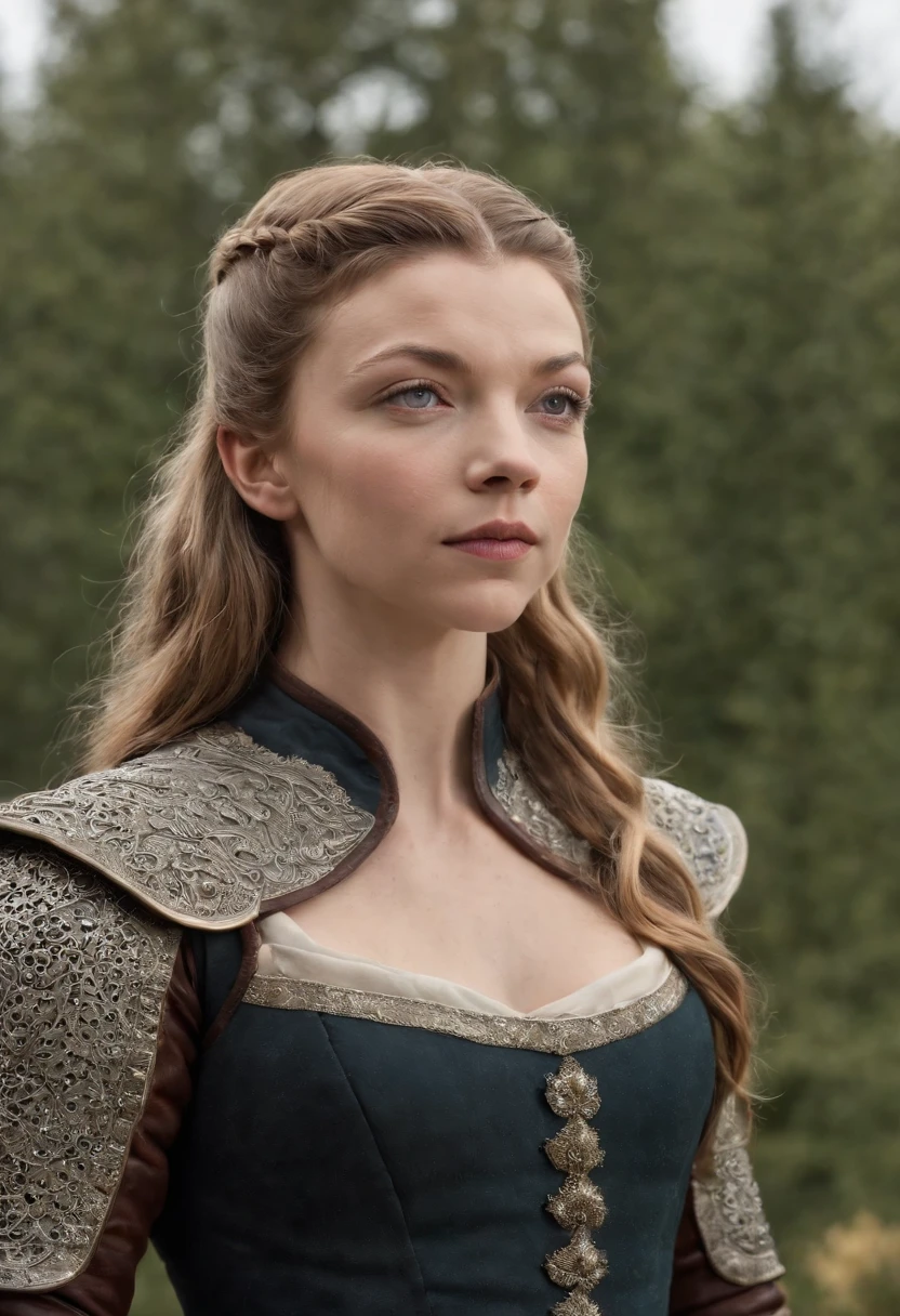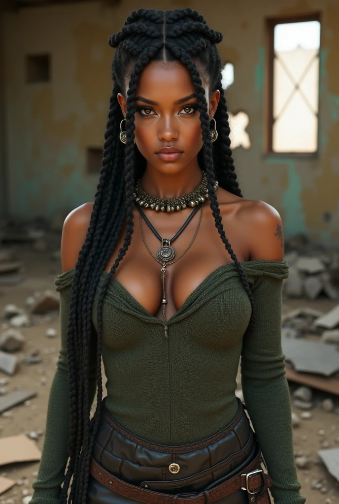 She wore a long dark green skirt that went down to the ankle with a single long split along the front that exposed brown boots that went about halfway up her calves and nearly the full length of her legs. She matched the skirt with a midriff baring top of the same color that laced closed in the front, held up by straps exposing the top of her chest yet also sported sleeves that left the shoulders bare and went down to just below the elbow.
