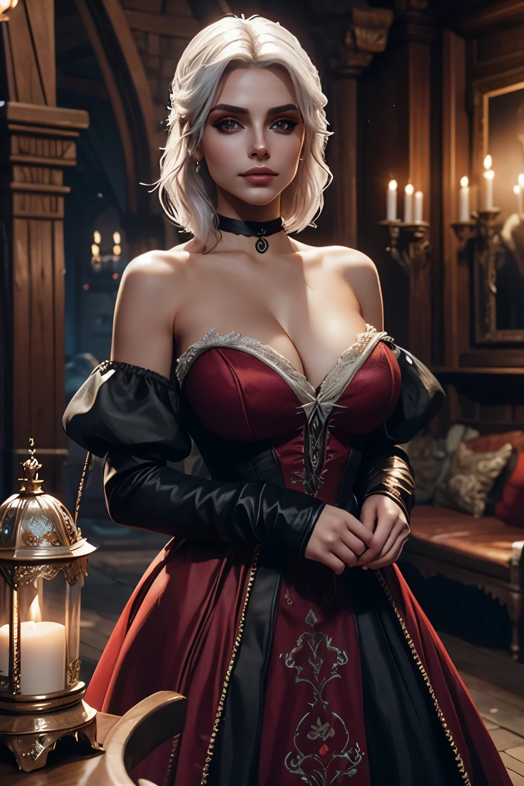 Madam Rosmerta chose that moment to make her appearance. She stood out from the rest as she wore a long red skirt and her top while similar in design to the rest of the girls on staff fully covered her torso but left a generous amount of cleavage on display.