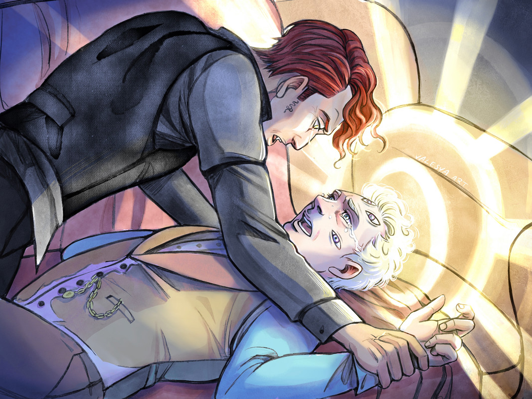 «Don’t say that! Shut up!» The angel shouted. «If you finish the sentence we will separate again, I don't want it!» The last words were followed by the ringing of a distant bell, while a warm and magnificent light flooded the room with faded outlines. Crowley was dazzled, but he didn't look away from the metamorphosis that took place beneath him.