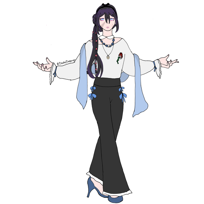The conversation he was having with Nanika seemed to have distracted him from his situation. As he was wandering around, he noticed something. He looked down in confusion, he wasn’t wearing these clothes before. In fact, he doesn’t think he’s ever worn anything like this. It was black with gold and purple accents, it draped over his body beautifully and felt as soft as silk. It probably was silk.