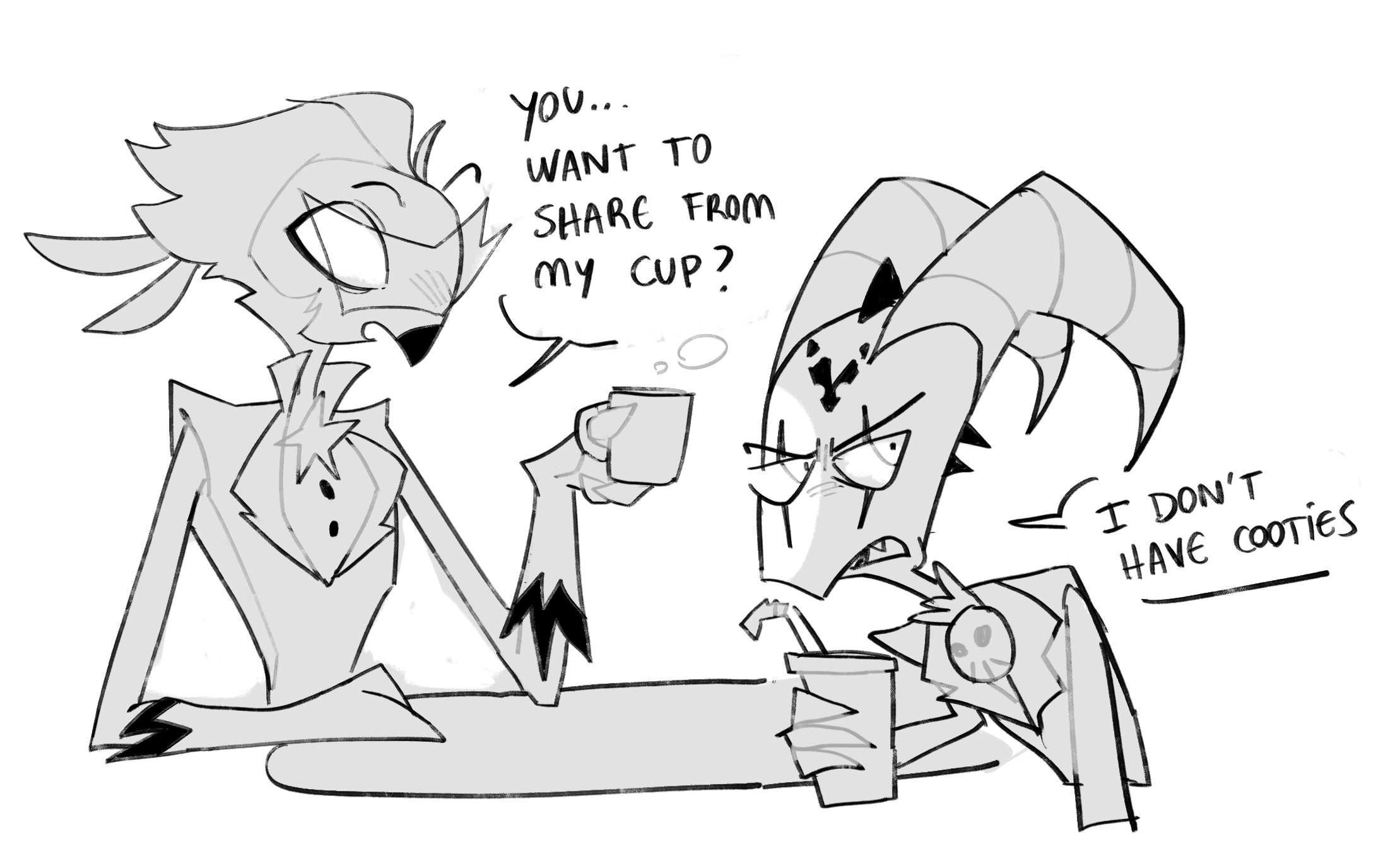 “I don’t have cooties if that's what you're worried about.” Blitzø rolled his eyes, “And you can have a sip of mine if you want.”