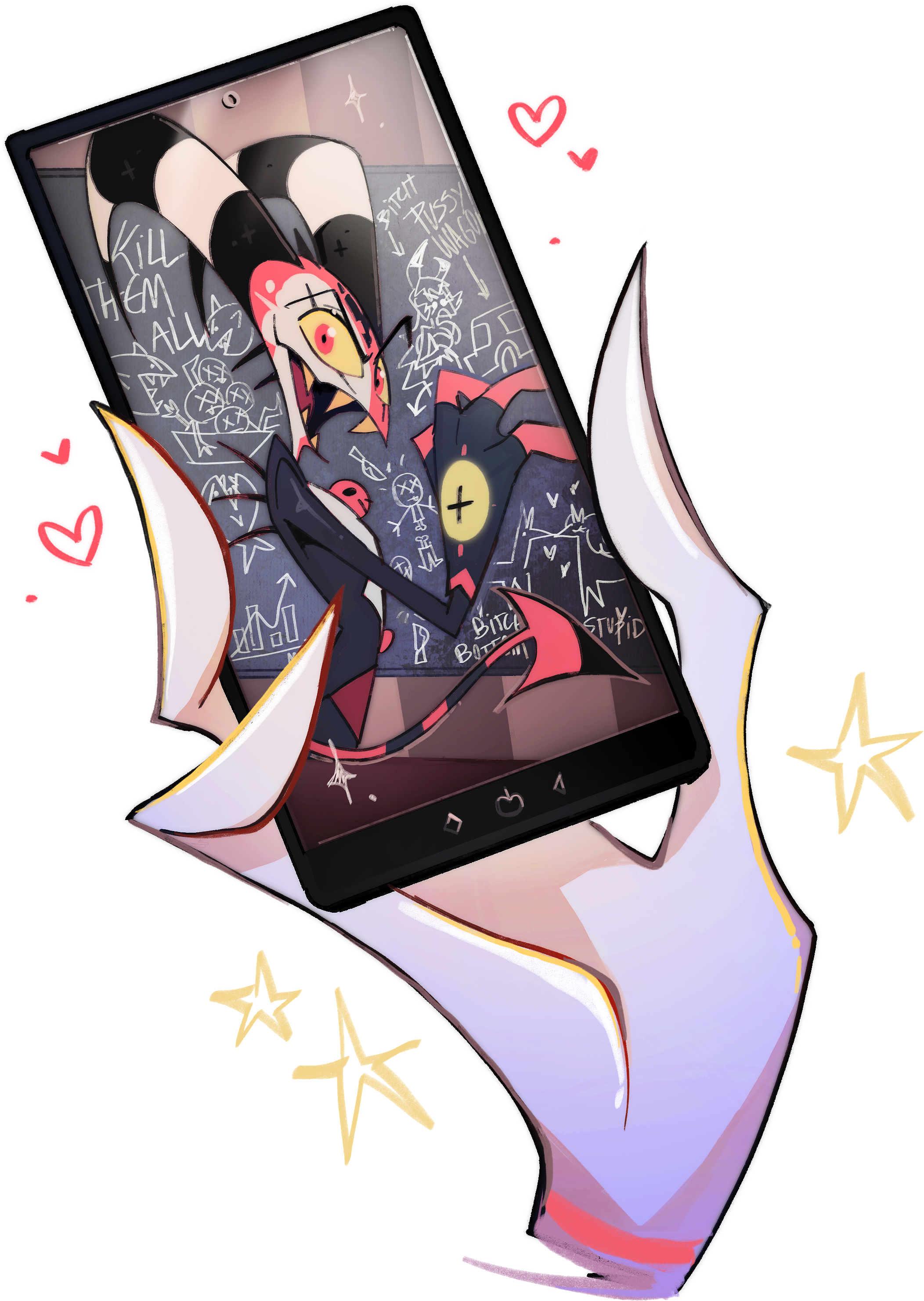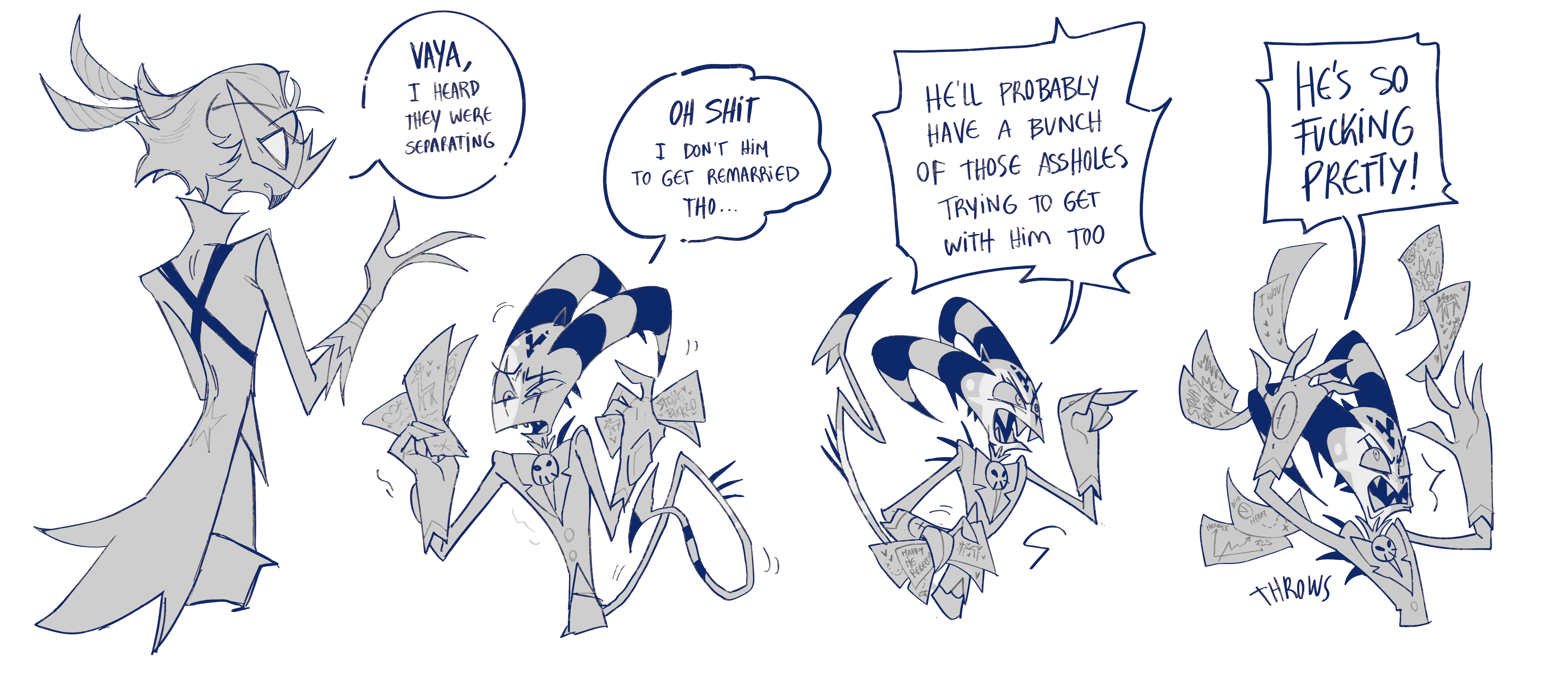 He noticed that some of these were covered in that chaotic writing while others had drawings. One, in particular, depicted the imp carrying Prince Stolas bridal style down an aisle as he flipped off another man standing at the altar, whose face was scribbled out and P.O.S. written on his shirt.
