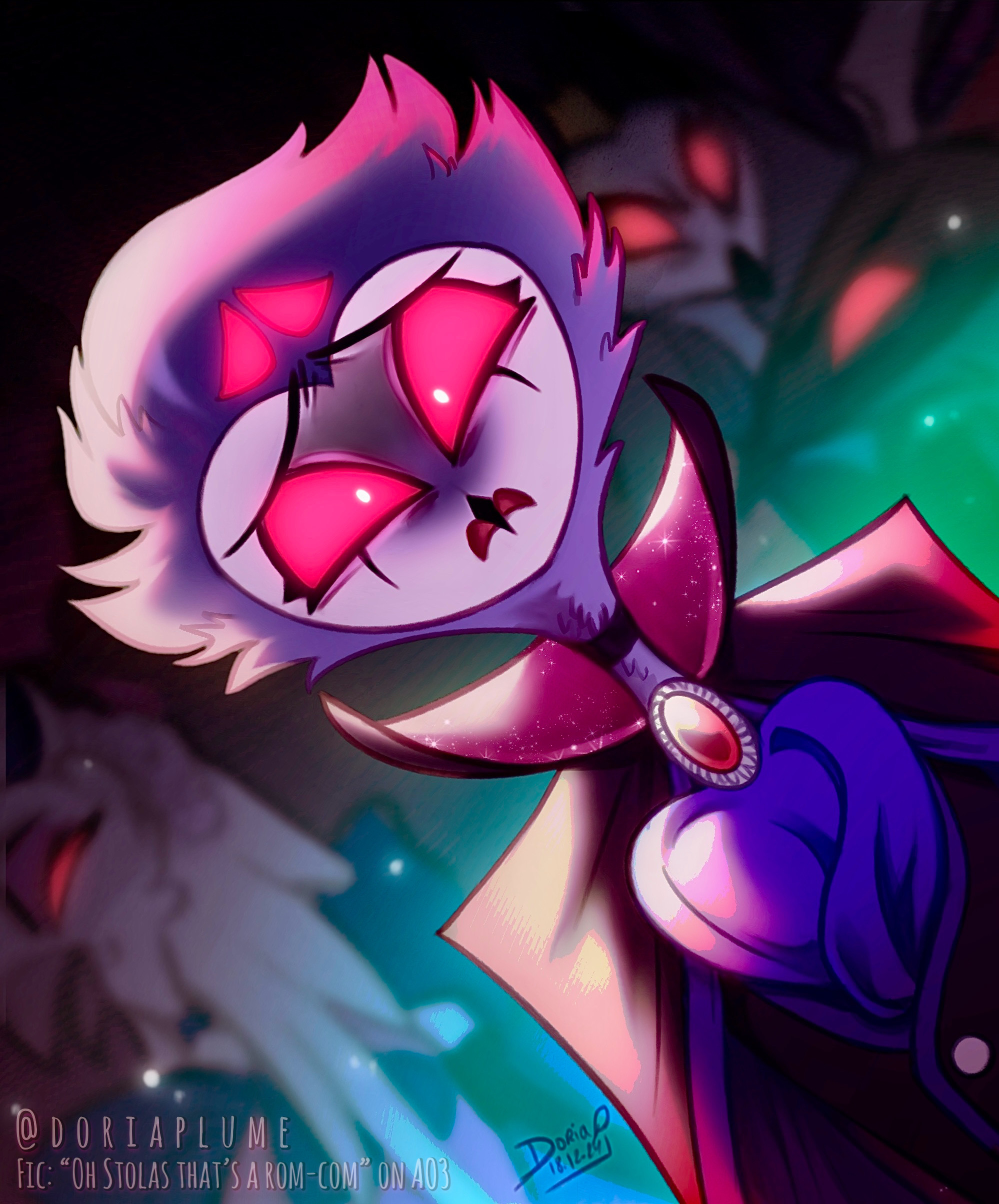 When he glanced over the crowd, he spied the grey feathers of Stolas amongst a sea of colourful lords and ladies. The other prince stuck out even more than usual in his dark ensemble, a deep purple blouse, black waistcoat and matching cape pinned out his nape by a gleaming red jasper. In line with Stolas’ whole motif, the inside of the cape shimmered with a red starry sky.