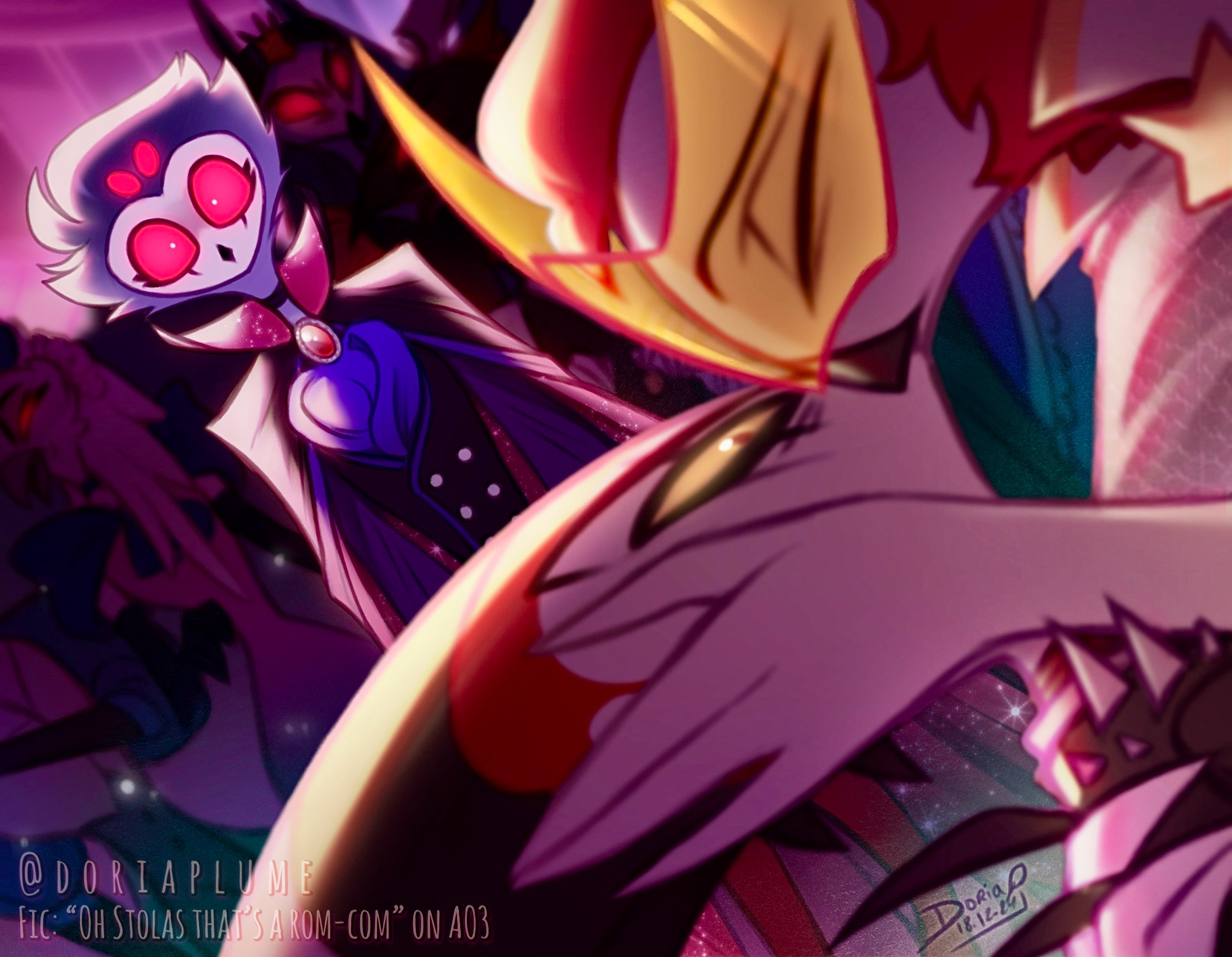 Blitzø let Vassago lead them in their dance. Whenever he glanced down at his feet to watch his steps, Vassago would tut, “You are doing perfectly, cariño.” As the music played on, getting closer to the end, his heart raced wildly. He was about to finally show Blitzø how he truly felt, about to put his whole heart into this display.