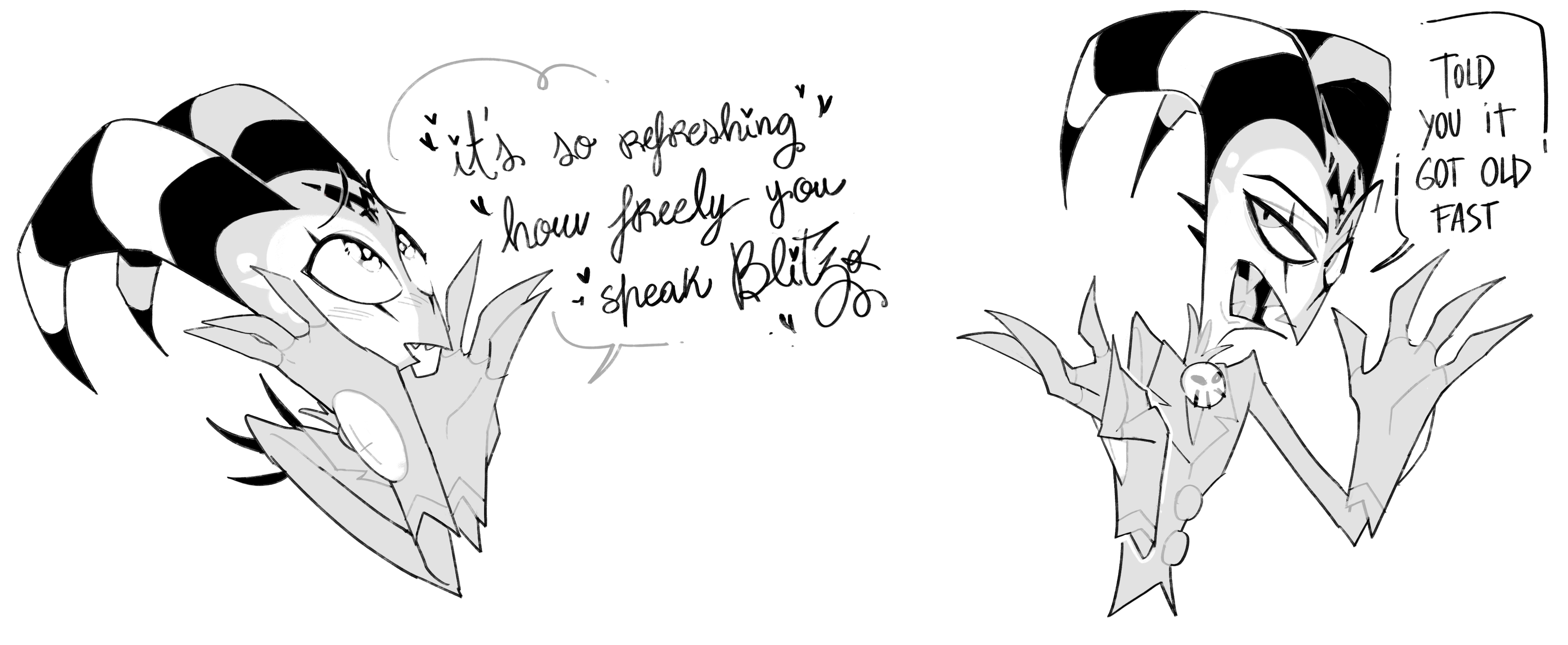 He scrutinized him briefly again then held out a hand. “Blitzø, the ‘o’ is silent.” Vassago eagerly gave him his hand, nearly missing the name as he focused on the heat of his large palm engulfing his gloved hand. He wished he did not have those gloves on. He wanted to feel his skin against his talons, the tickle of his claws against his wrist; he had never reacted this way to a simple handshake before.