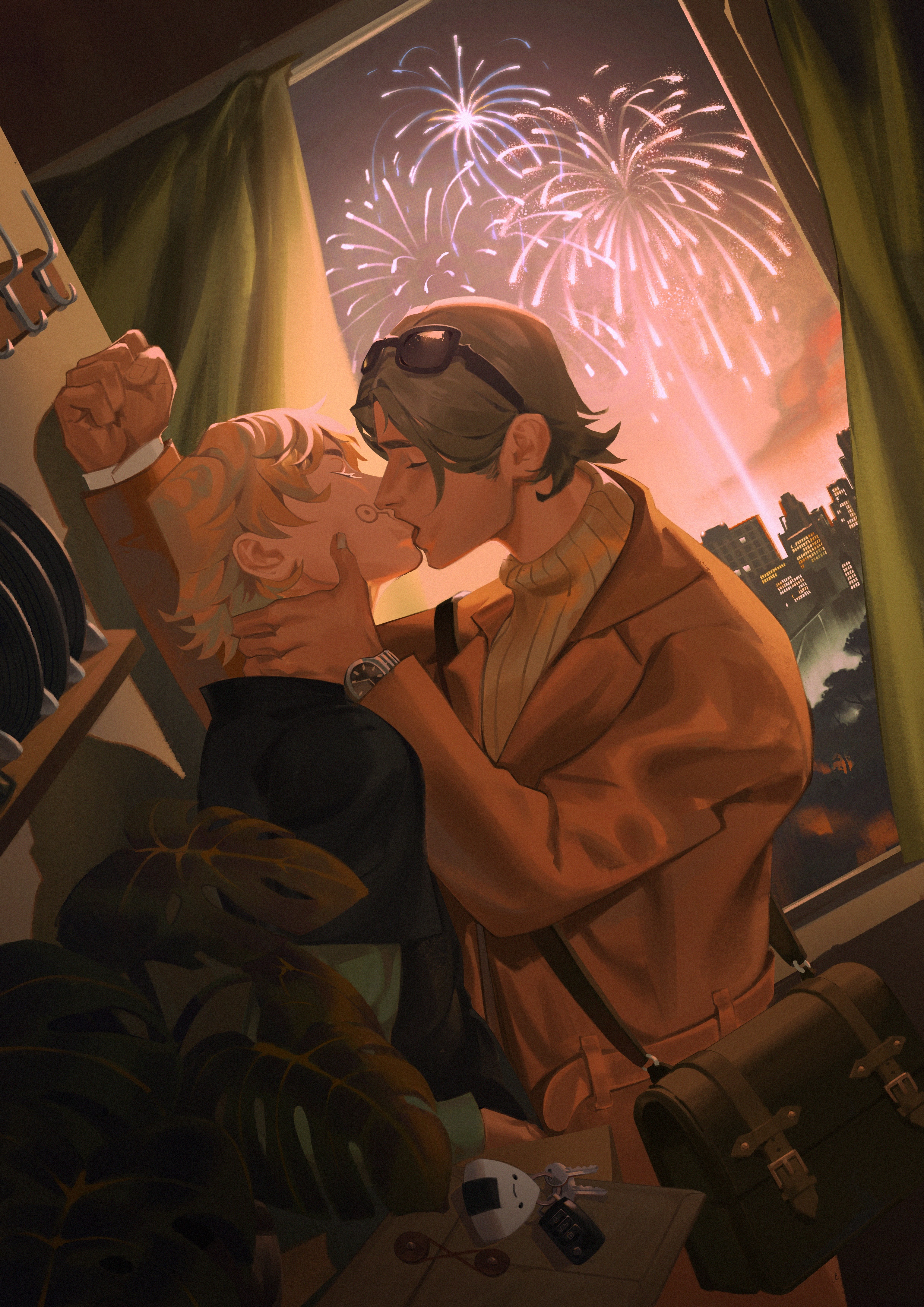 Yuuta doesn’t know how to kiss. He’s anxious about it, he opens his mouth and Inumaki pulls him in by the neck, and his hand comes up to brace against the wall, curling over a hook hanging off it. He kisses Inumaki again and lowers his hands to Inumaki’s waist, rubs his palms over his shirt, the underside of it to touch his flesh, lifts him up ever so slightly to pin him against the wall. The booming echo of fireworks outside fills his chest with a flutter of warmth. How something so loud can be so quiet. How something so still can be so vivid.