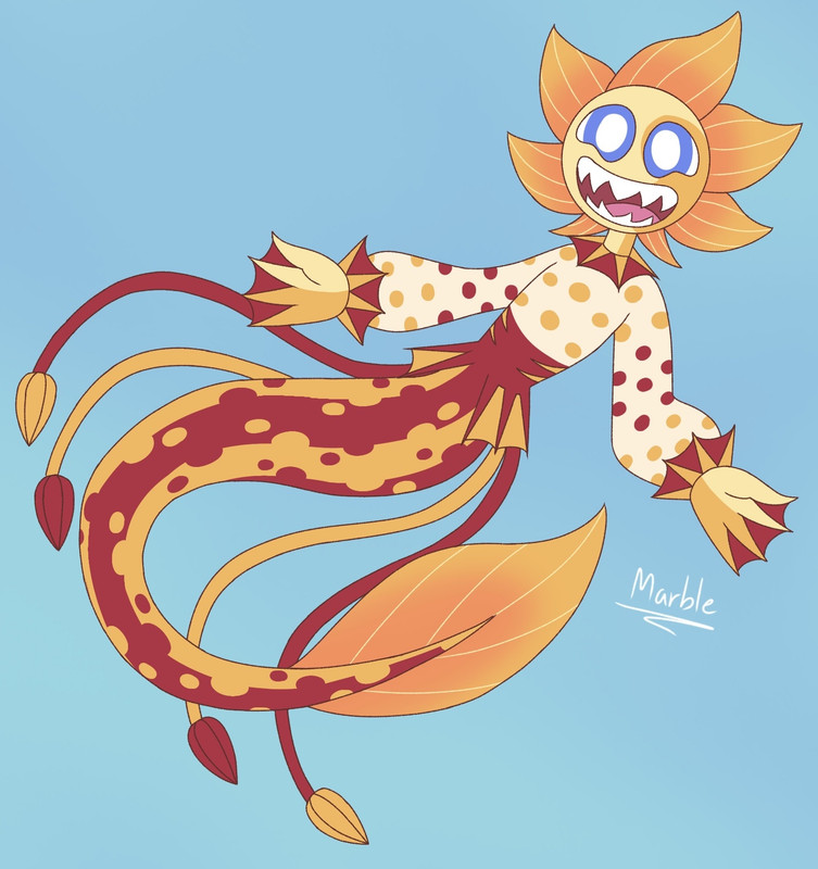 His claws twitched in anticipation, frills pressed against his head fin, watching a small school of silver fish swim by. Sun’s hands darted out from the coral he camouflaged with, snatching up many of the fish. His four tendrils doing the same. Small feelers flying out of their bud like casings, ensnaring more of the fish.