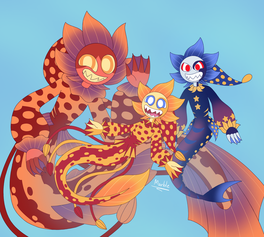 Sun giggled into his hands while Moon’s brain had to play catch up, staring blankly at you. He then buried his face into your chest with an embarrassed groan, drawing more chuckles from you and Sun. You gave the top of his head and head fin gentle strokes, smiling warmly at him.
