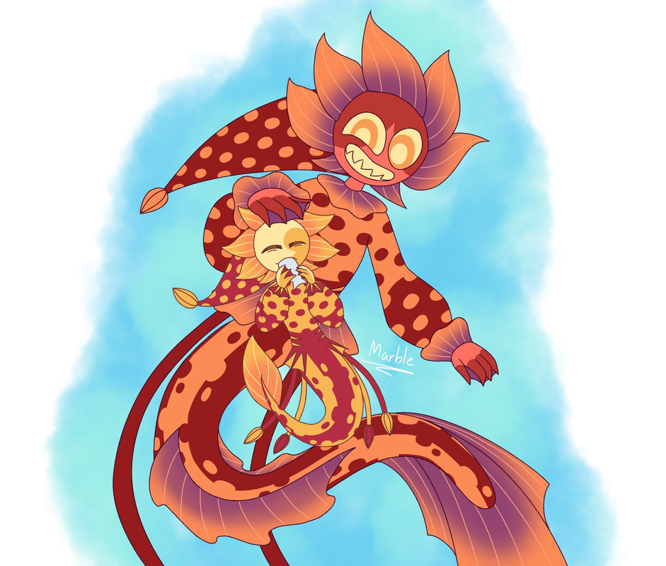 A larger, fully grown, red and orange mer emerged from behind. No longer hiding his darker scales within the duller coral. Two long tendrils follow, gliding alongside his tail. Yellow tinted teeth exposed as Eclipse fondly returns the gesture. He kneaded Sun’s head frills as they lax from his head fin.