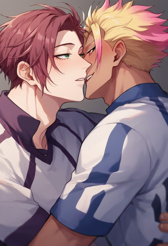 The blonde is momentarily stunned and jerks backwards, but his attempt to pull away only serves to ignite Sae’s determination further. His free hand snakes around Shidou’s neck, keeping him locked in. The heat radiating from him is too warm, his muscular frame pressing insistently into the other’s. Shidou can’t help but feel his cock twitch in his sweatpants at the aggressive display and his mind can’t seem to keep up. Sae breaks the kiss abruptly, leaving the football player gasping for air.