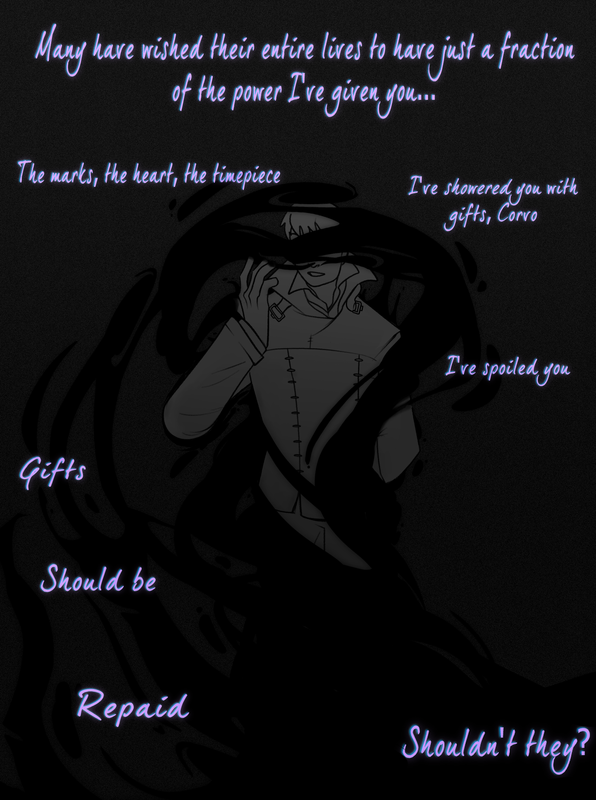 "Correct." The voice wound around him, its presence caging him. "But I do wonder... when one is given a gift that lifts them from ruin, crowns them with power-" The voice shifted, passing behind him. The air grew heavier, Corvo's lungs laboring. "-Should they not repay that debt?"