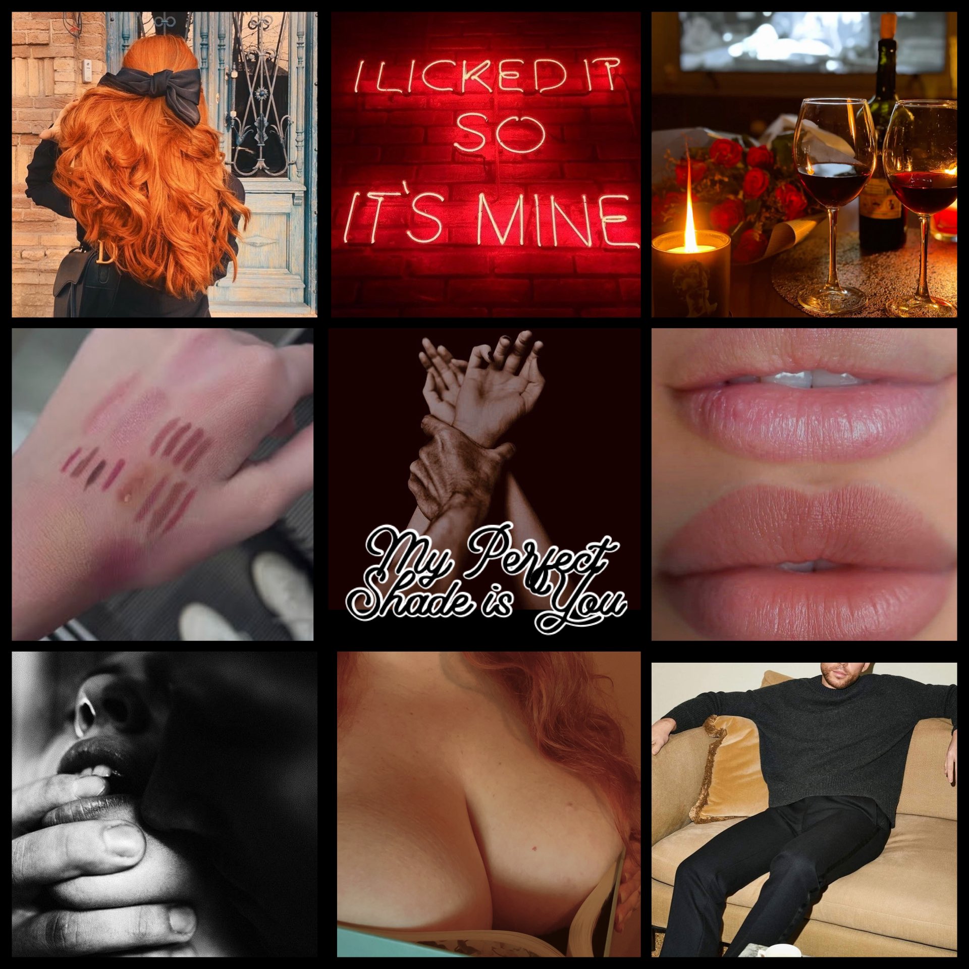 In his mind, she was there; naked and flushed, lips wrapped around his cock, her eyes locked onto his, teasing and hungry. Her mouth slick with him. Her lips painted in one of those shades. His cum dripping over the color, down her chin.