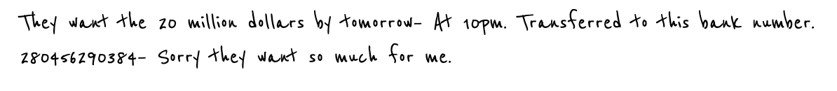 Once his arm was free, the man pointed to the paper and pencil once more, “Write your dear old mentor a note, tell them you have been kidnapped, that you are hurt, we want 20 million dollars, and that if we don’t have it by tomorrow at 10pm you will be killed.”