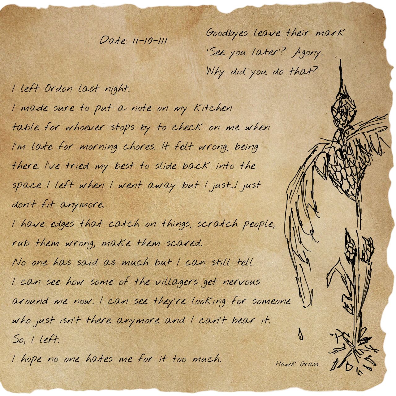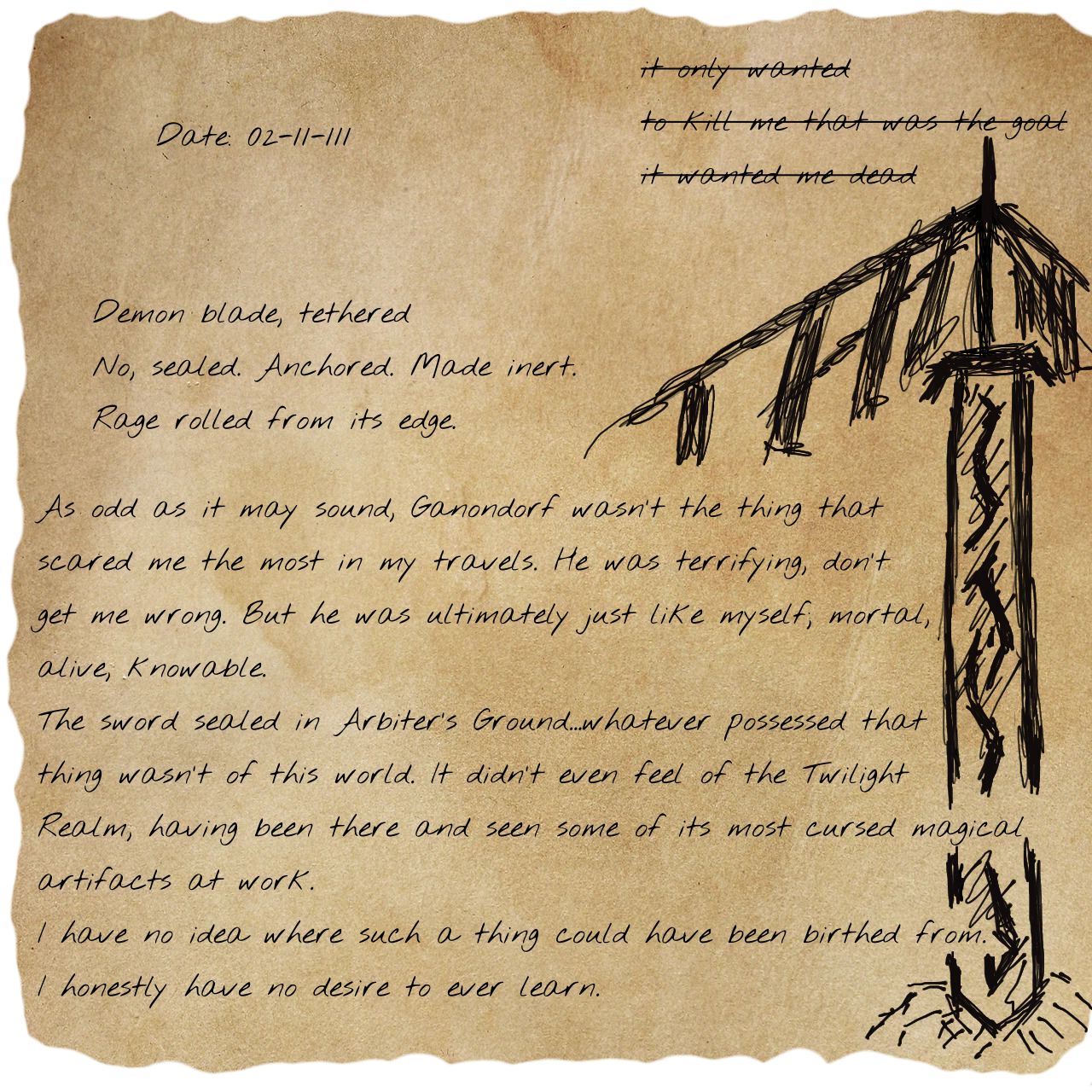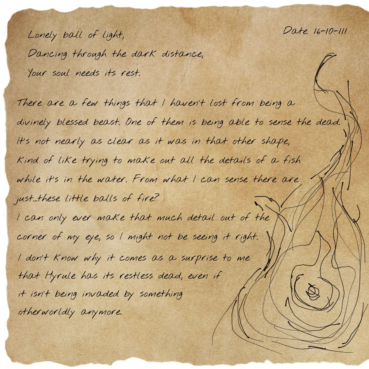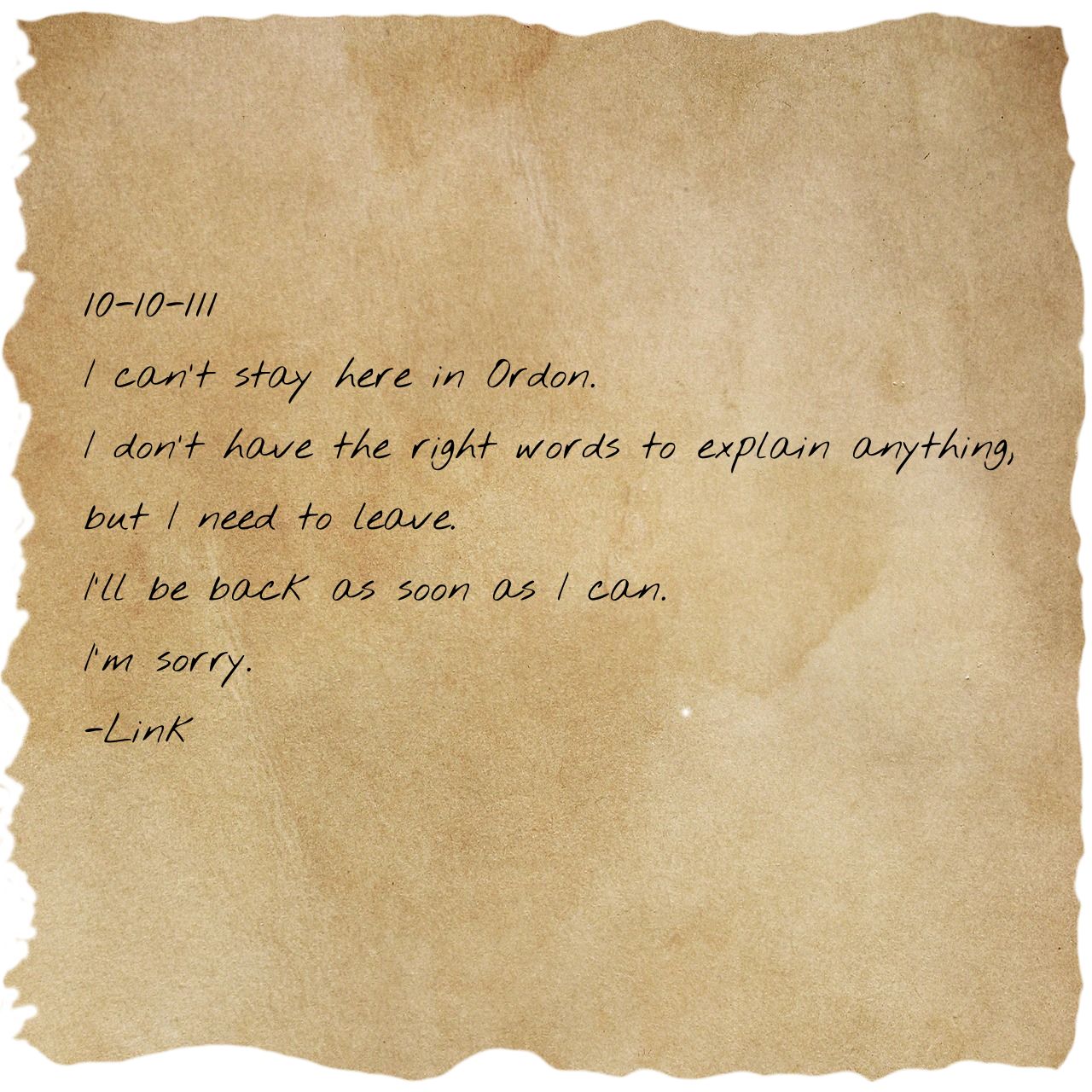 Carefully, as to not damage the small journal, Link tore a page from it, quick to write a note before leaving his home in Ordon once more. What he wrote was short, simple, and read: