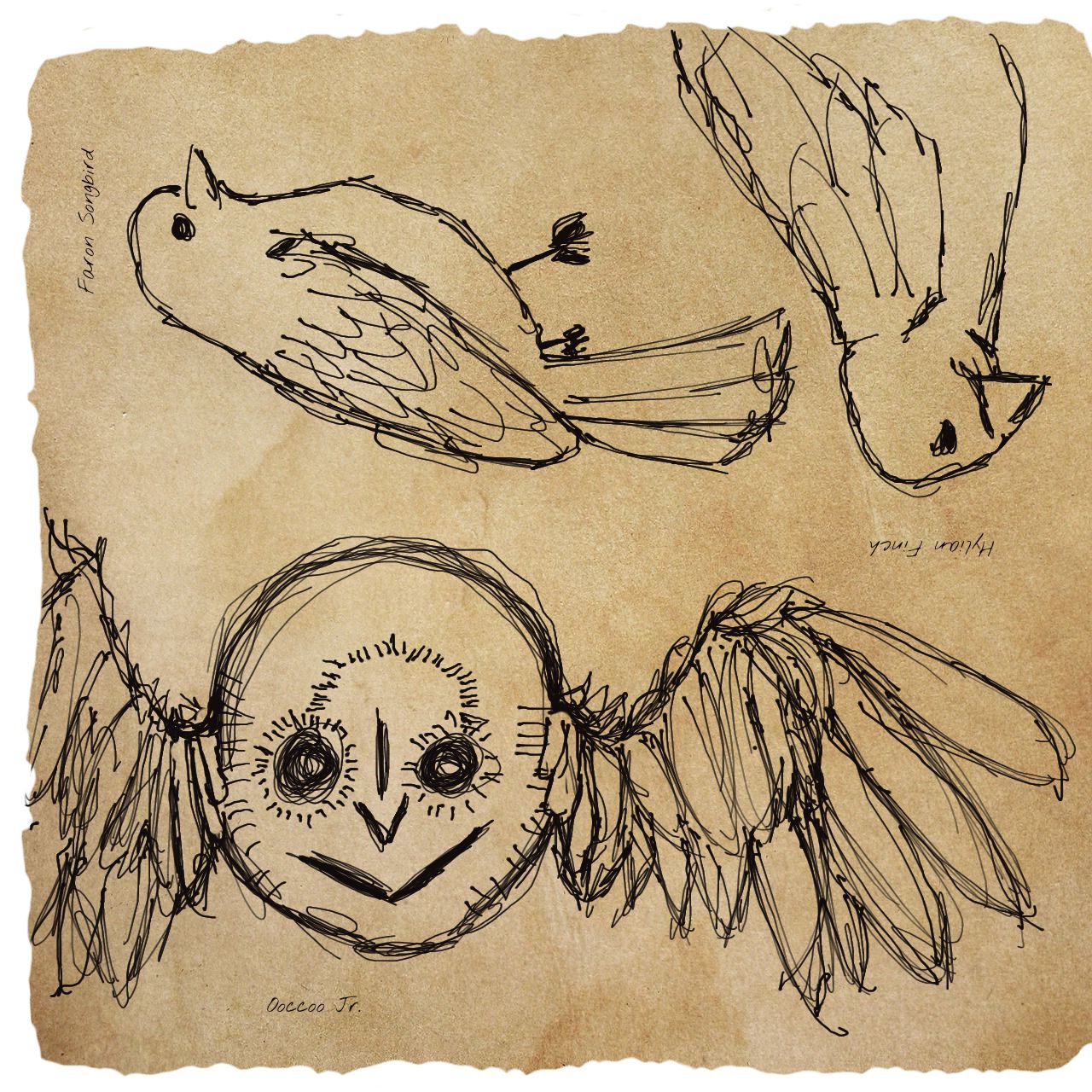 [Image description: A haiku, dated journal entry, and sketch of Poe Fire on parchment paper. Haiku is in upper left corner, sketch in bottom right corner, journal entry fills remainder of page.