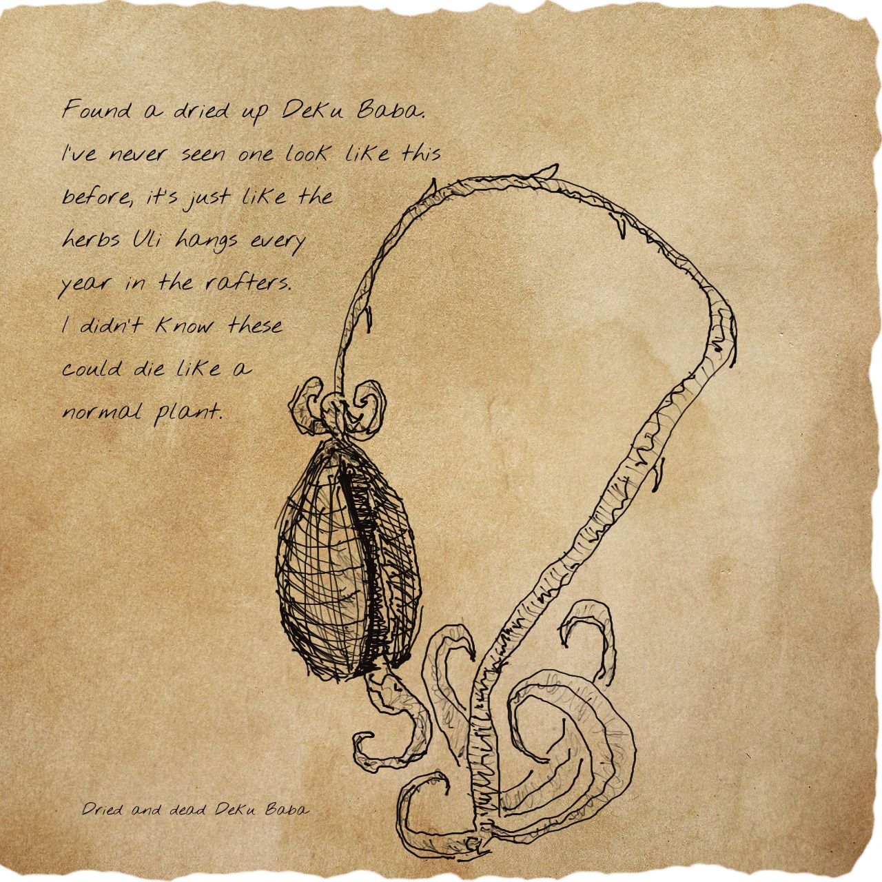 [A undated journaled entry and a sketch of a dead Deku Baba plant on parchment.