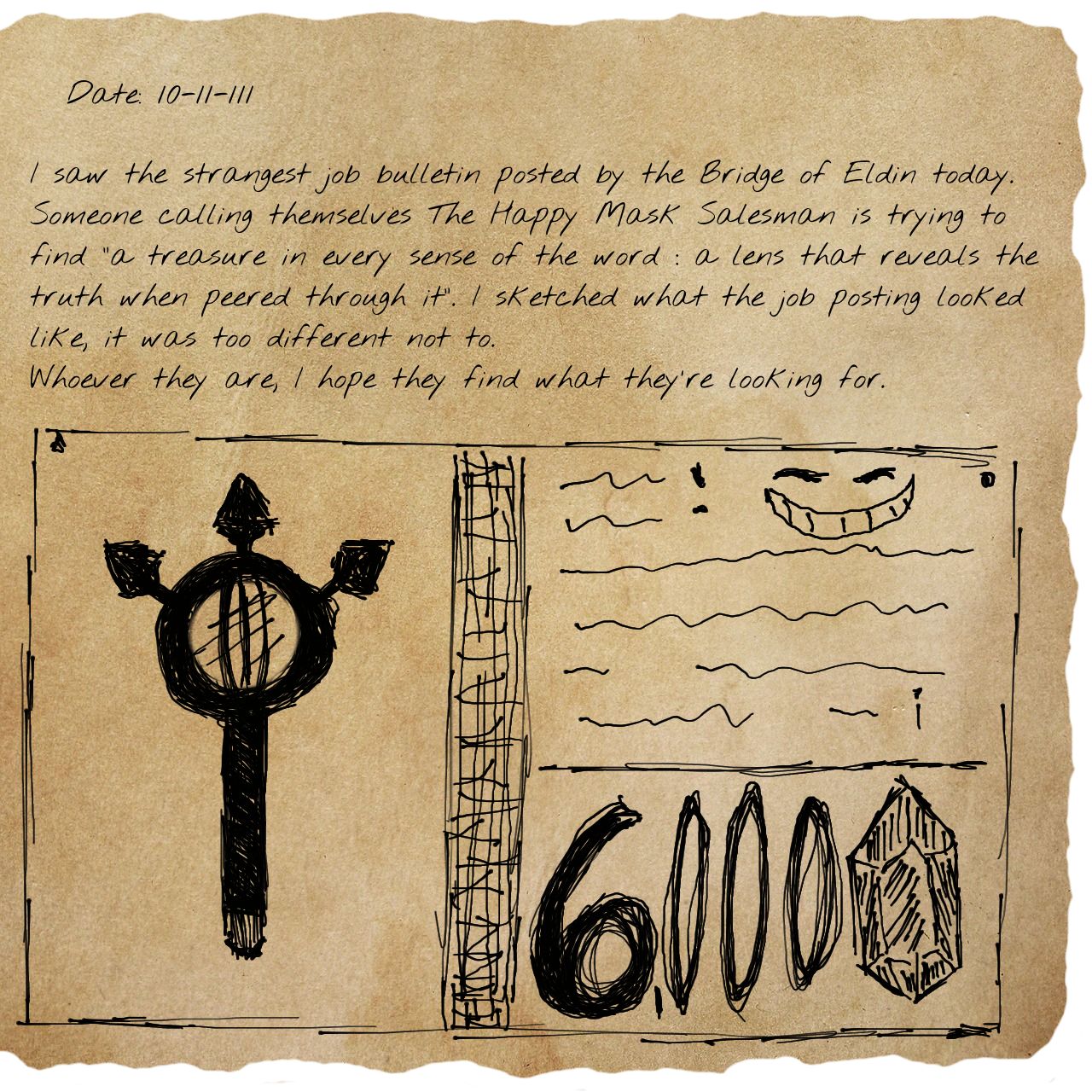 I saw the strangest job bulletin posted by the Bridge of Eldin today. Someone calling themselves The Happy Mask Salesman is trying to find "a treasure in every sense of the word: a lens that reveals the truth when peered through it". I sketched what the job posting looked like, it was too different not to.