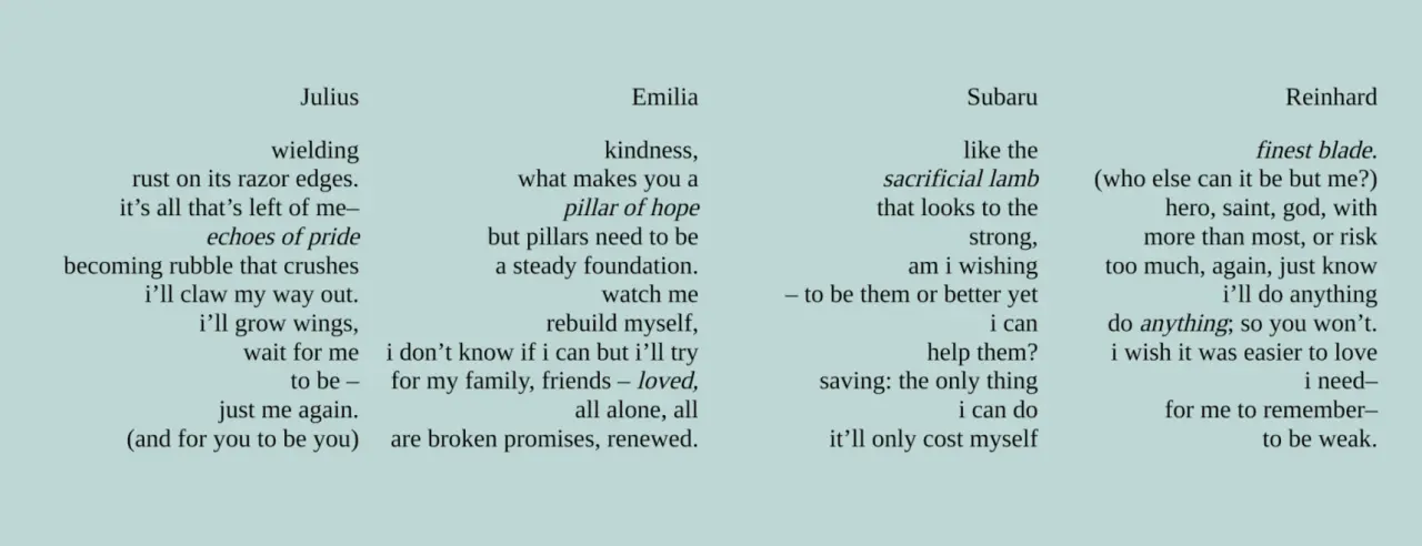 Subaru reaches out to a mass of lavender hair matted with blood. Reinhard's heart leaps into his throat, except it doesn't because he doesn't have a heart anymore, his body is only made out of light and gold, but he knows these people, his soul strains to be with them again —