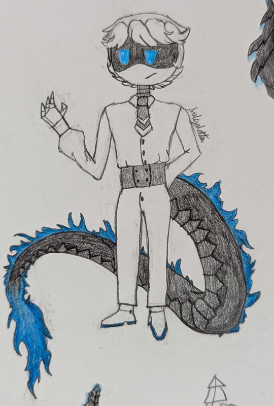 His tail—draconic, black-scaled, lined with synthetic fur looking like blue fire—waves with each step. His neon blue optics lock onto each human stuck within the cells, yet are quick to flick away.